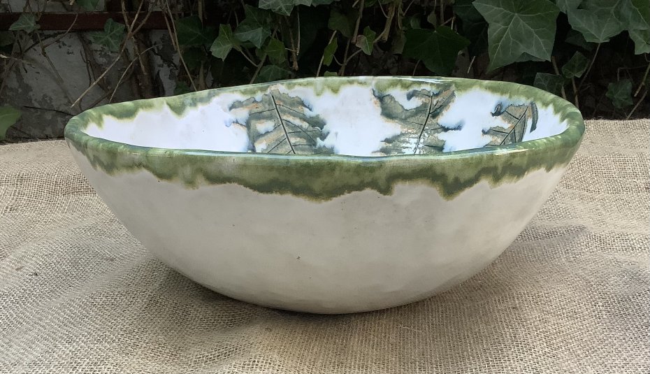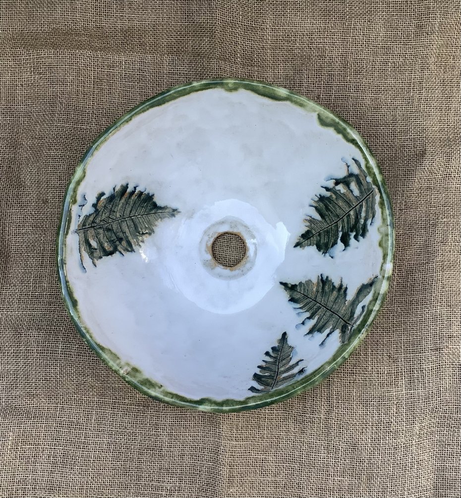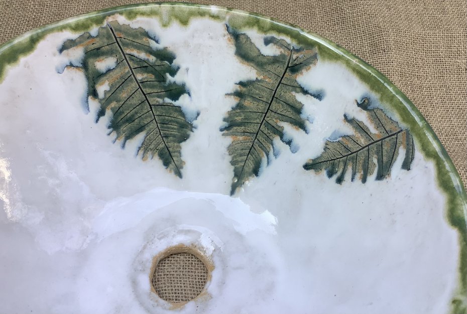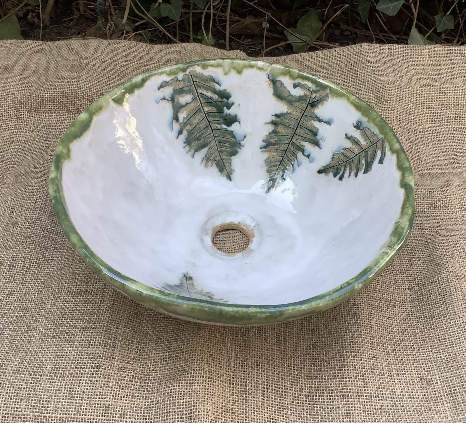 Ręcznie wykonana umywalka z białej ceramiki z zielonym wzorem paproci w środku. Umywalka jest szkliwiona wewnątrz i na zewnątrz białym błyszczącym szkliwem. Paprocie i rant umywalki poszkliwione na zielono. Odporna na detergenty, wysokie i niskie temperatury. Wykonana ręcznie z gliny szamotowej w naszej pracowni. Umywalka sprawi, że każde wnętrze będzie wyglądać niesamowicie!