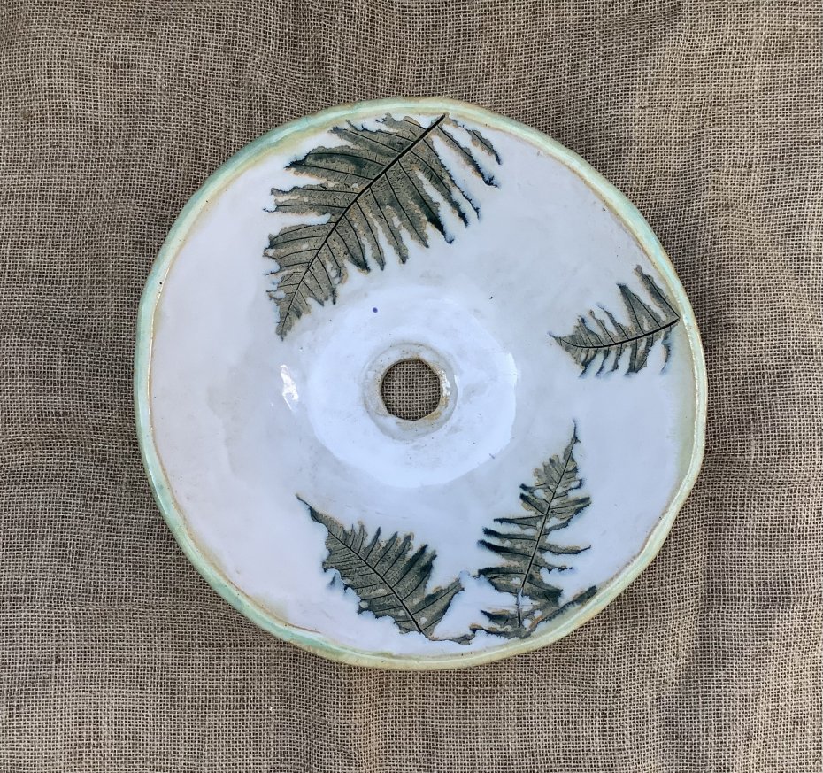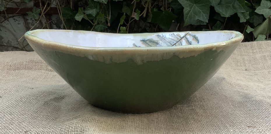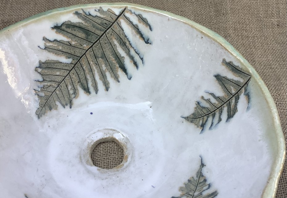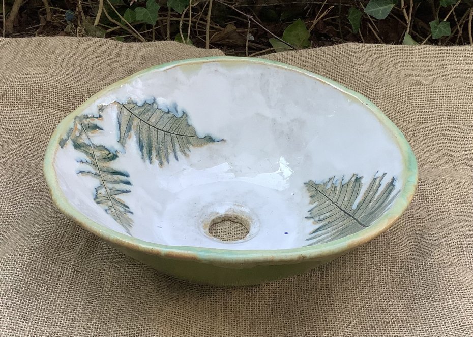 Ręcznie wykonana umywalka z białej ceramiki z zielonym wzorem paproci w środku. Umywalka została poszkliwiona wewnątrz białym szkliwem. Na zewnątrz jest szkliwiona na zielono. Na umywalce odbite są 4 liście paproci. Odporna na detergenty, wysokie i niskie temperatury. Wykonana ręcznie z gliny szamotowej w naszej pracowni. Umywalka sprawi, że każde wnętrze będzie wyglądało niesamowicie!