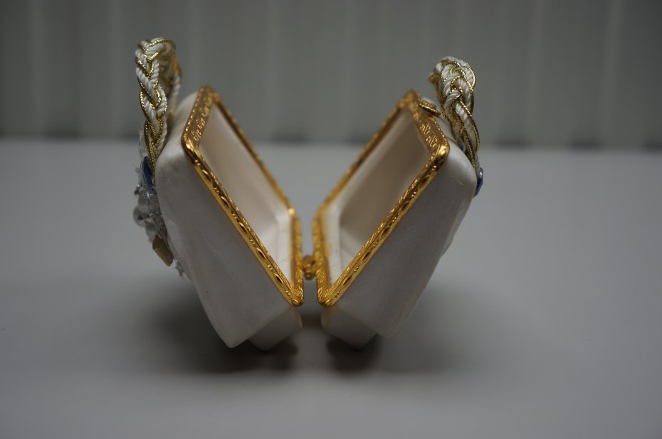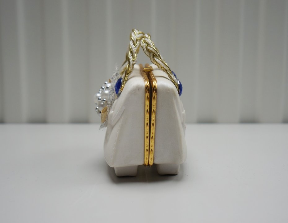 Ozdobne pudełko na drobiazgi lub drobną biżuterię w kształcie miniaturowej torebki. Metalowe zapięcie typu bigiel. Rączka ozdobnie pleciona. Przedmiot bogato zdobiony koronką, perełkami i błyszczącymi akcentami. Ze względu na swoje ozdobne cechy i estetykę przypomina kolekcjonerską figurkę. Przedmiot na spodzie sygnowany. Stan bardzo dobry.