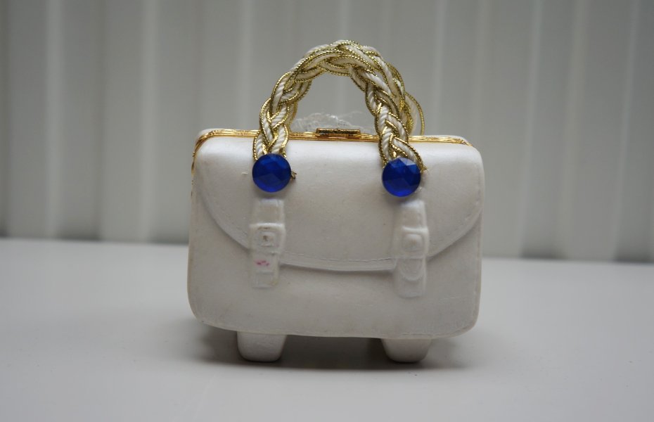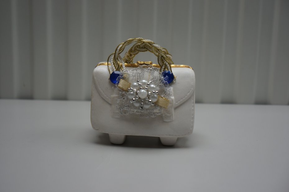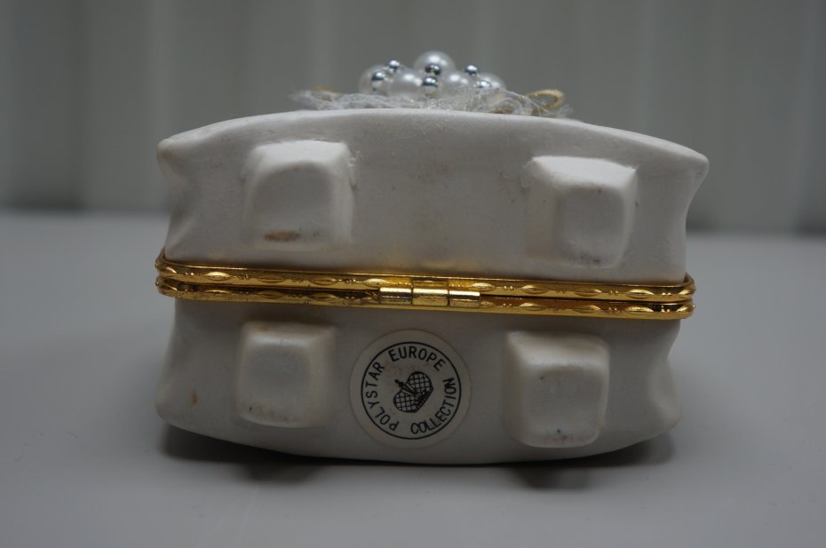 Ozdobne pudełko na drobiazgi lub drobną biżuterię w kształcie miniaturowej torebki. Metalowe zapięcie typu bigiel. Rączka ozdobnie pleciona. Przedmiot bogato zdobiony koronką, perełkami i błyszczącymi akcentami. Ze względu na swoje ozdobne cechy i estetykę przypomina kolekcjonerską figurkę. Przedmiot na spodzie sygnowany. Stan bardzo dobry.