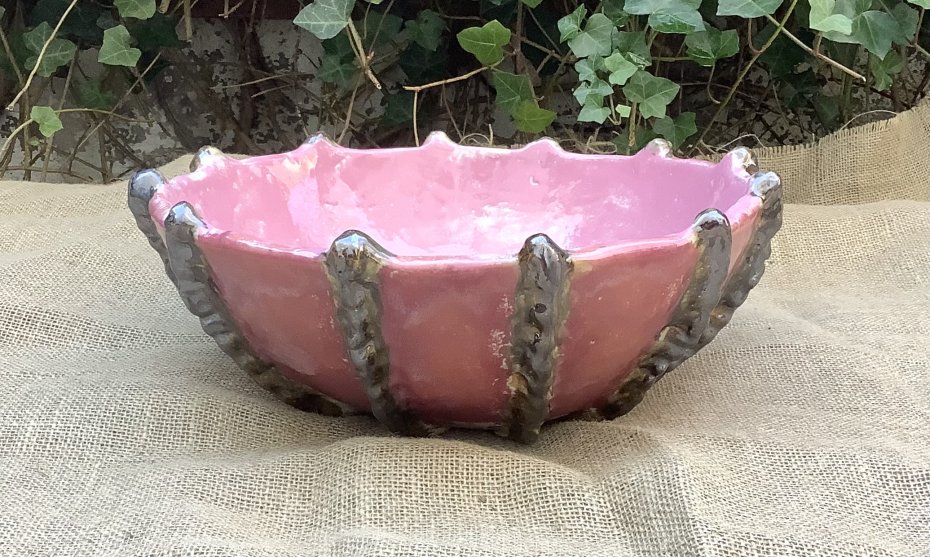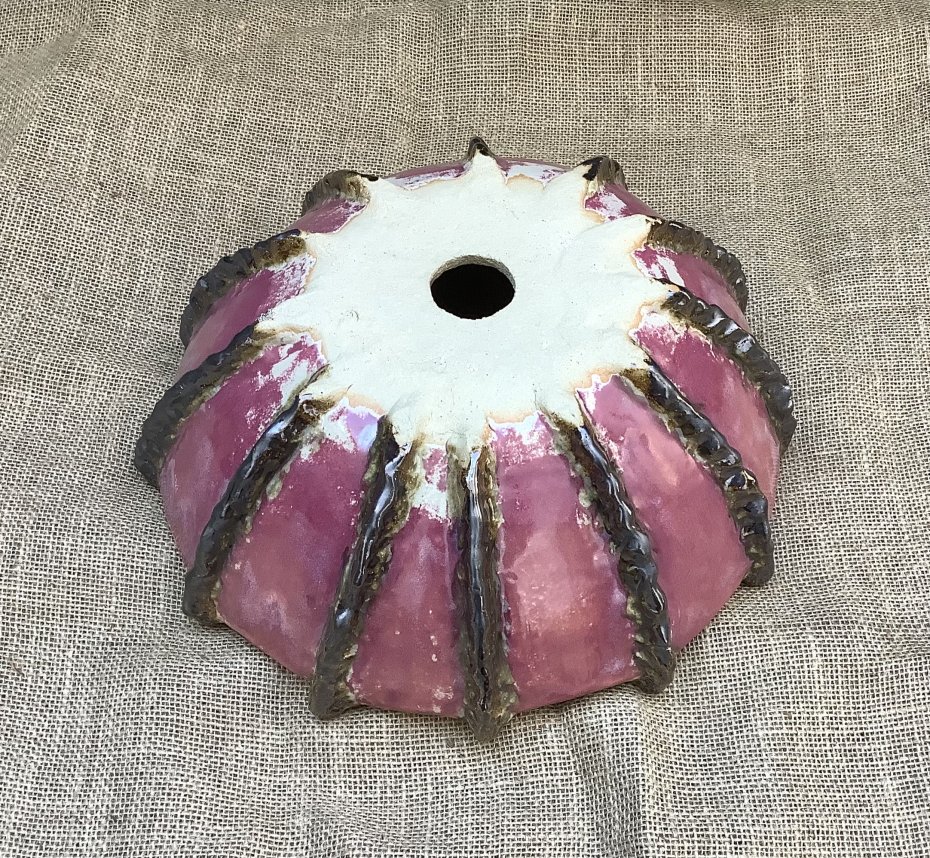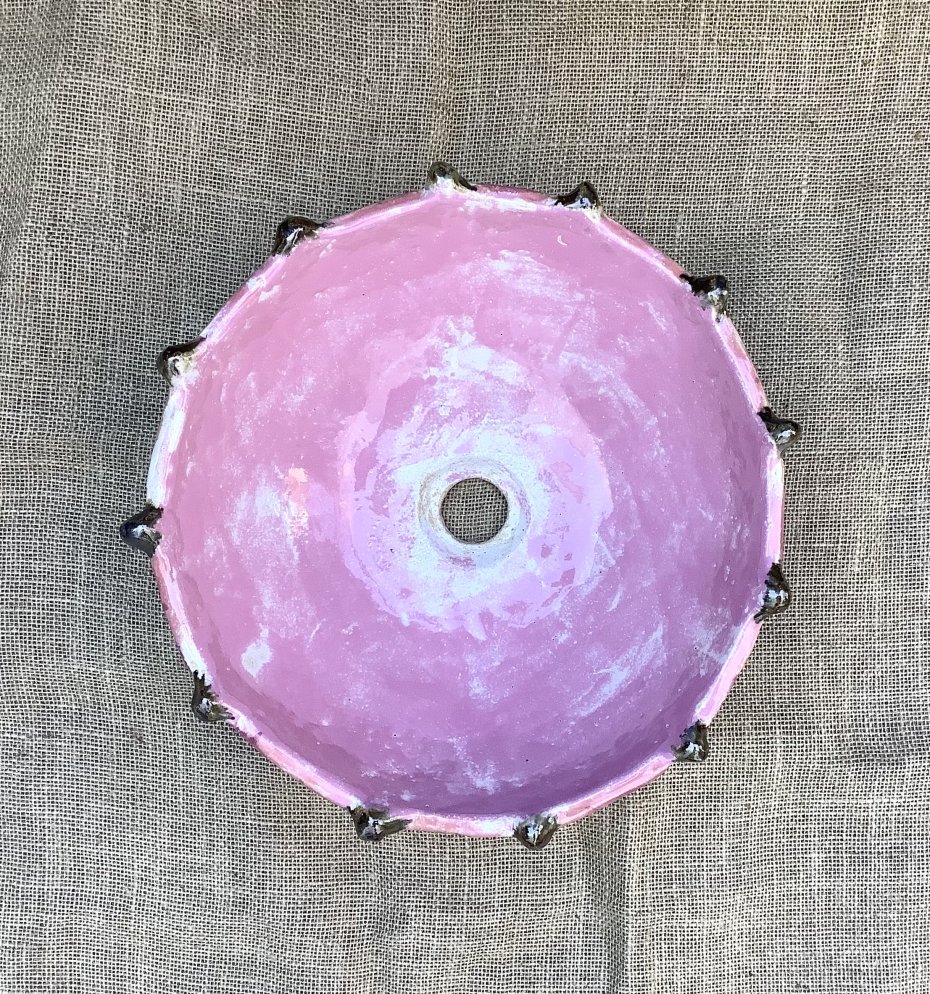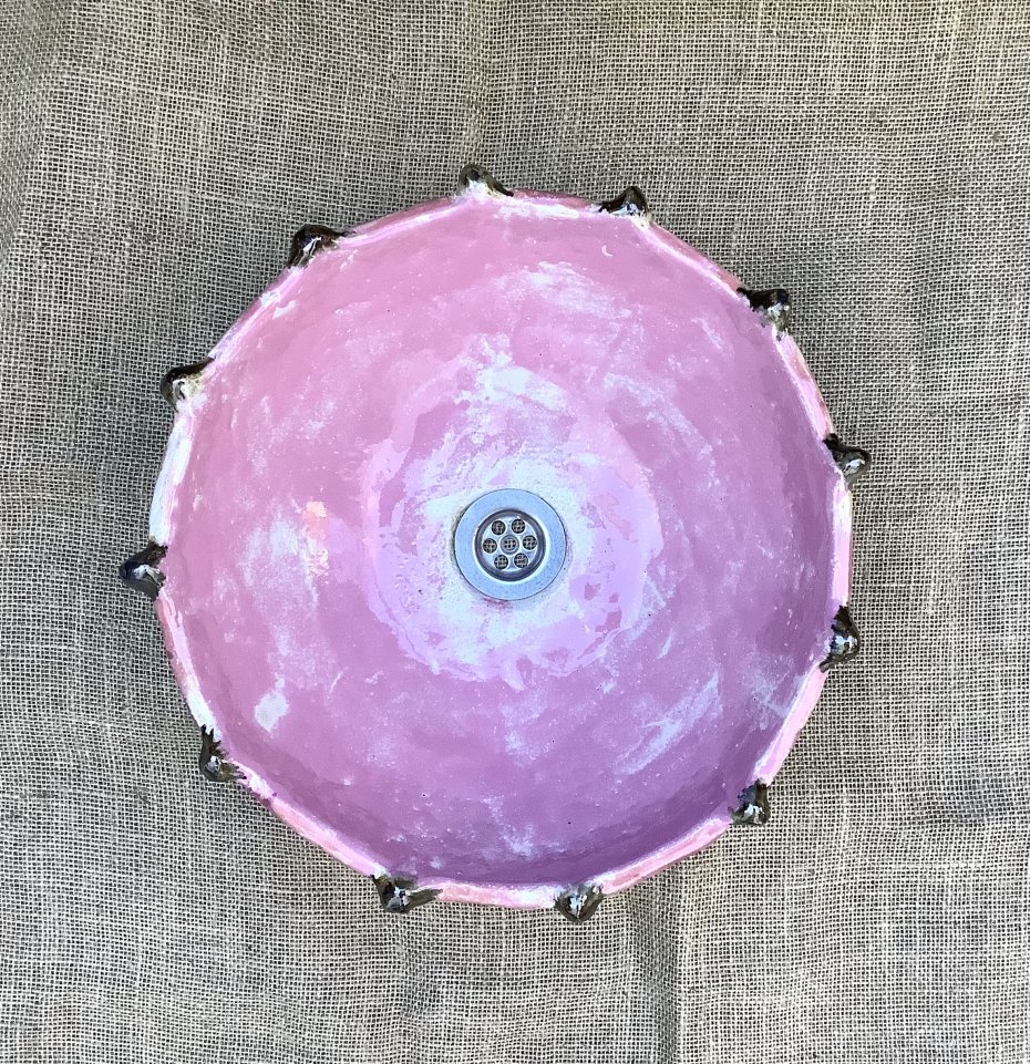 Umywalka został zrobiona na wzór jeżowca. Poszkliwiona wewnątrz pięknym różowym szkliwem z jaśniejszymi przebarwieniami, na zewnątrz w ciemniejszym odcieniu różu z nutą wiśniową. Wystające elementy poszkliwione są w kolorze starego złota.