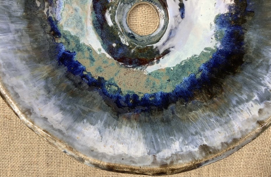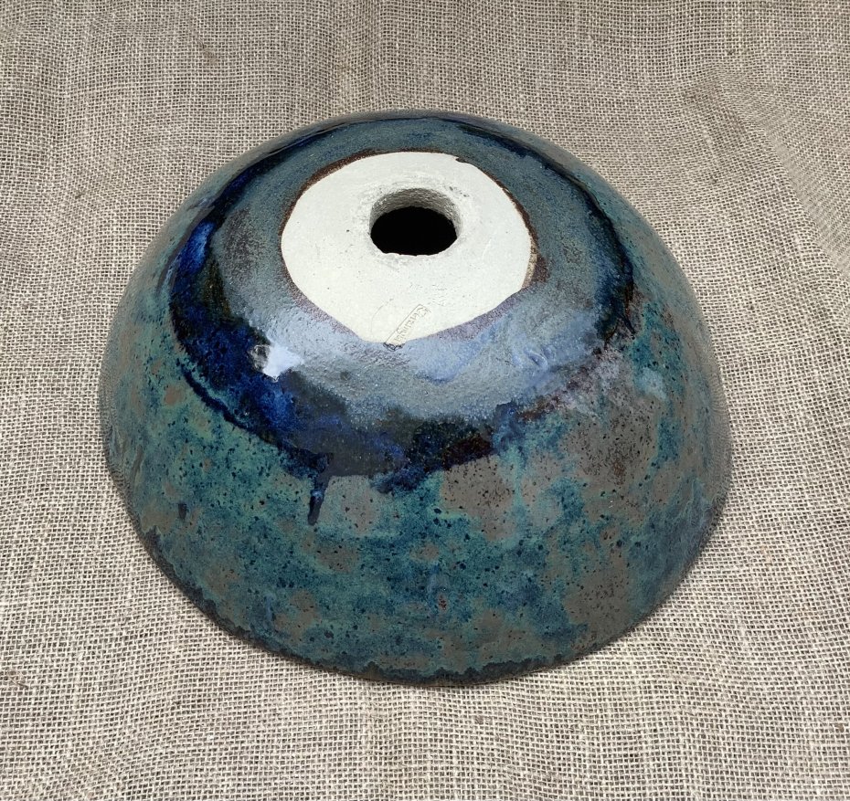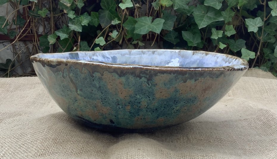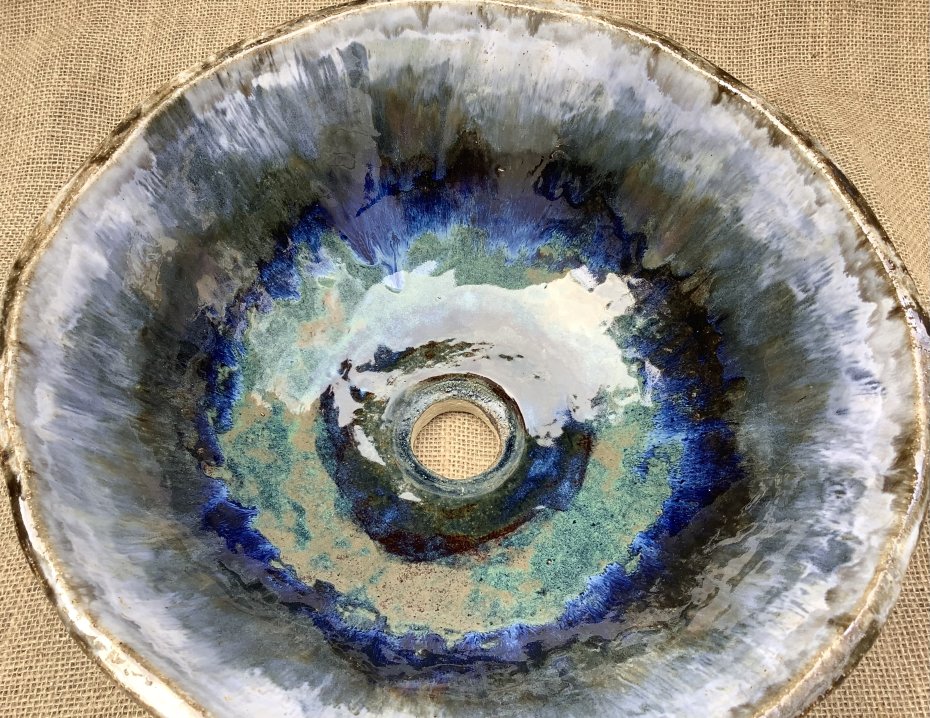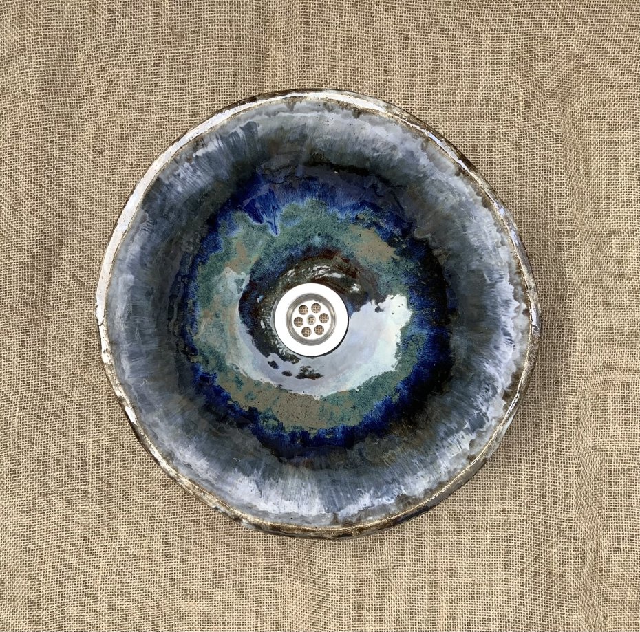 Umywalka została wykonana całkowicie ręcznie, więc nie jest idealnie okrągła. Poszkliwiona różnymi odcieniami niebieskich szkliw, aż do białego, z efektem cieniowania, przenikania kolorów na całej powierzchni. Na zewnątrz poszkliwiona w niebiesko-zielonym odcieniu z brązowawymi prześwitami. Wypalona na 1250 stopni, w pełni odporna na temperatury.