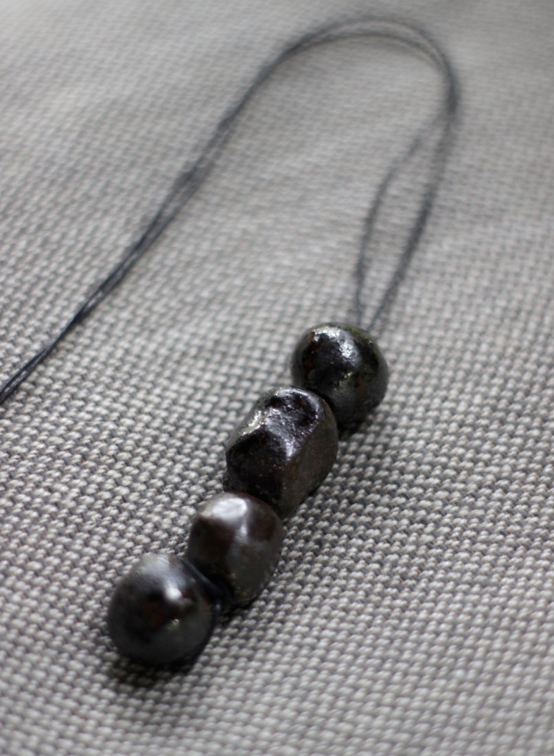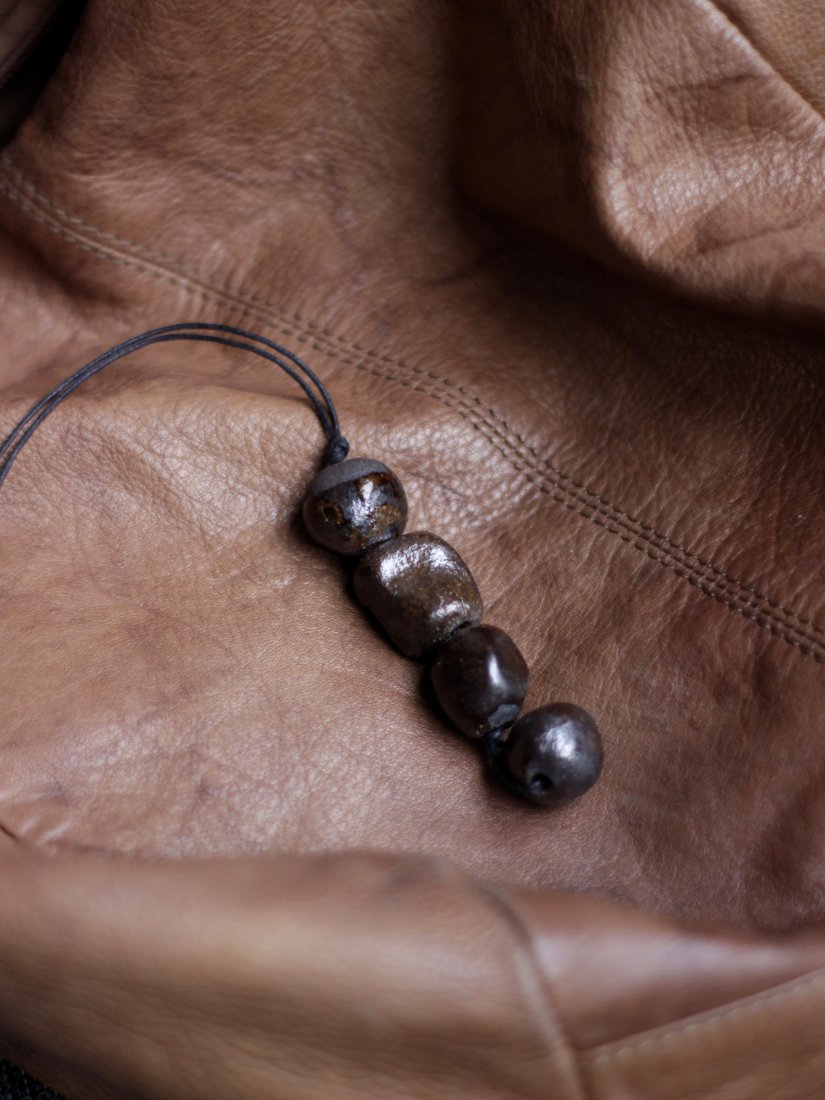 Oryginalna, ręcznie wykonana ceramiczna zawieszka. Ulepiona z ciemnej gliny, pokryta ciemnobrązowym szkliwem, czteroelementowa.