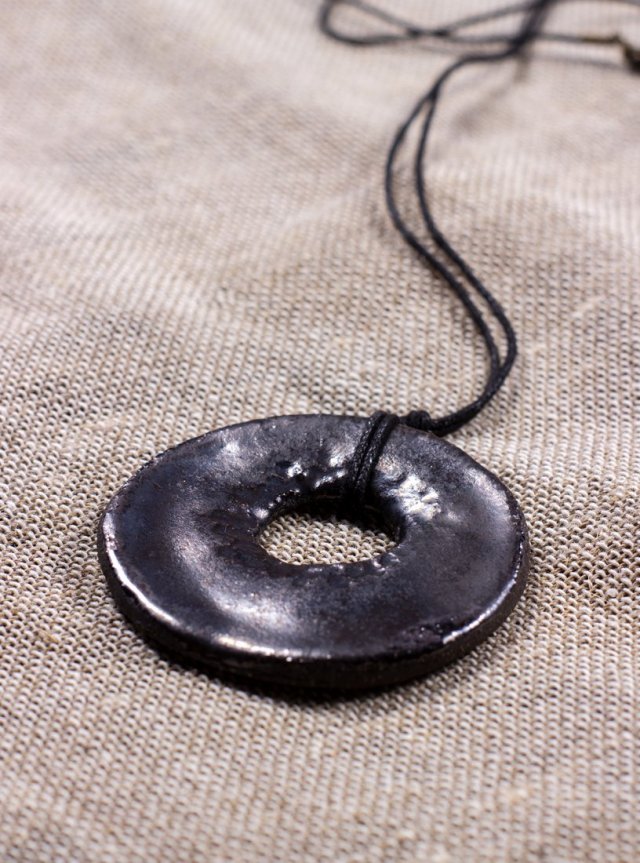 Ręcznie wykonana ceramiczna zawieszka. Ulepiona z ciemnej gliny, pokryta grafitowym szkliwem z lekkim połyskiem.