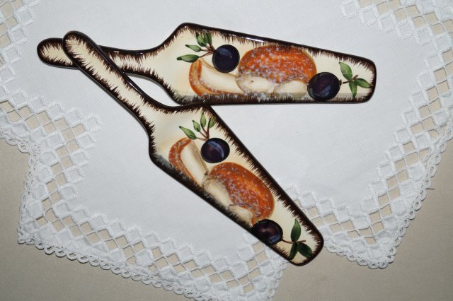 Para ceramicznych ozdobnych łopatek do ciasta, ręcznie malowane- motyw owocowy, stonowane kolory, wierzchnio szkliwione na błyszcząco, klasyczny kształt