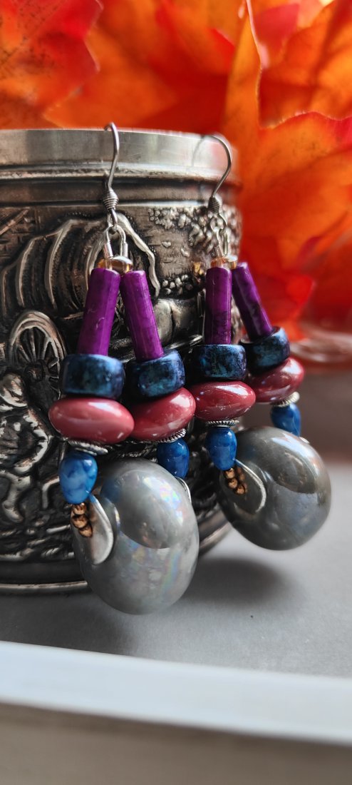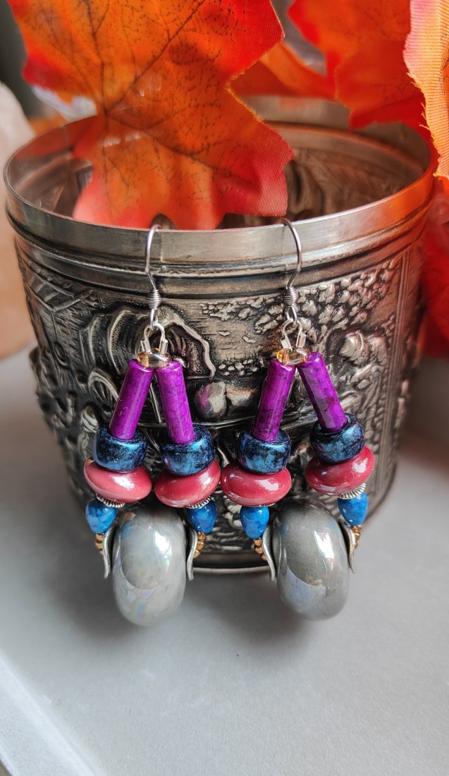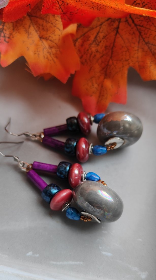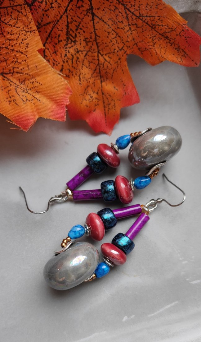 ,, ceramiczne,, to oryginalne wiszące kolczyki wykonane z koralików wykonanych z ceramiki,fioletowego i niebieskiego marmuru i szklanych koralików. Kolczyki zawieszone są na klasycznych biglach wykonanych ze stali szlachetnej.