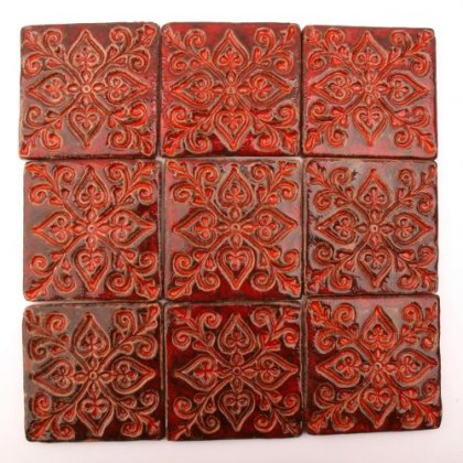 zestaw 9 dekorów ceramicznych w kolorze ciemnej, brudnej czerwieni. Wyjątkowe, bo wykonane ręcznie. Funkcjonalne, bo w obsłudze nie różnią się od tradycyjnej glazury - ułożenie i pielęgnacja.