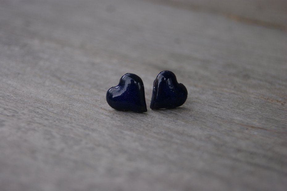 Śliczne małe ceramiczne kolczyki sztyfty w kształcie serduszek. Wykonane z lekkiej ciemnej gliny pokryte niebieskim błyszczącym szkliwem które nadają im wyjątkowy powierzchnię.