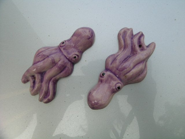 Ręczna robota. Nie sygnowane. Szkliwione. Fioleto-róze w różnym barwy natężeniu. Na błyszcząco wykończone. Ozdobne :) Mają dziurkę na mini gwożdzik,bądz śrubkę,ale mozna je też przykleić, bądz położyć.