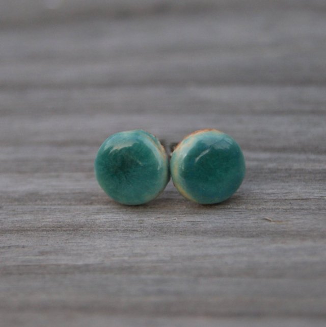 Śliczne małe ceramiczne kolczyki sztyfty w kształcie kółeczek. Wykonane z lekkiej jasnej gliny pokryte specjalnym turkusowym szkliwem które nadają im wyjątkowy powierzchnię.