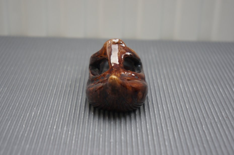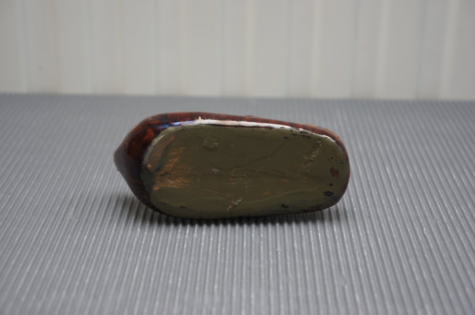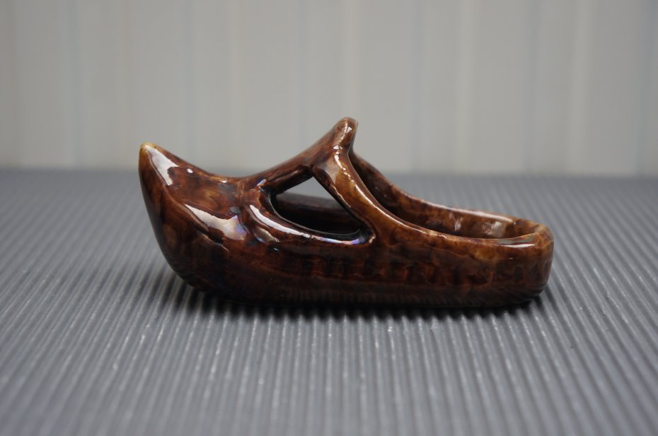 Mały, ceramiczny bucik o kształcie kierpca. Szkliwiony. Kolor ciemny brąz. Stan bardzo dobry.