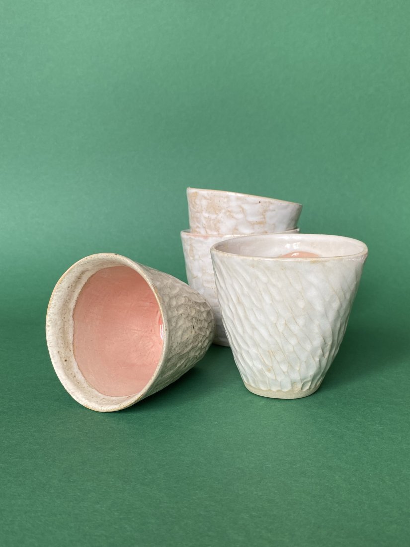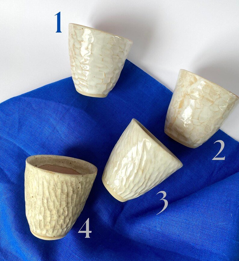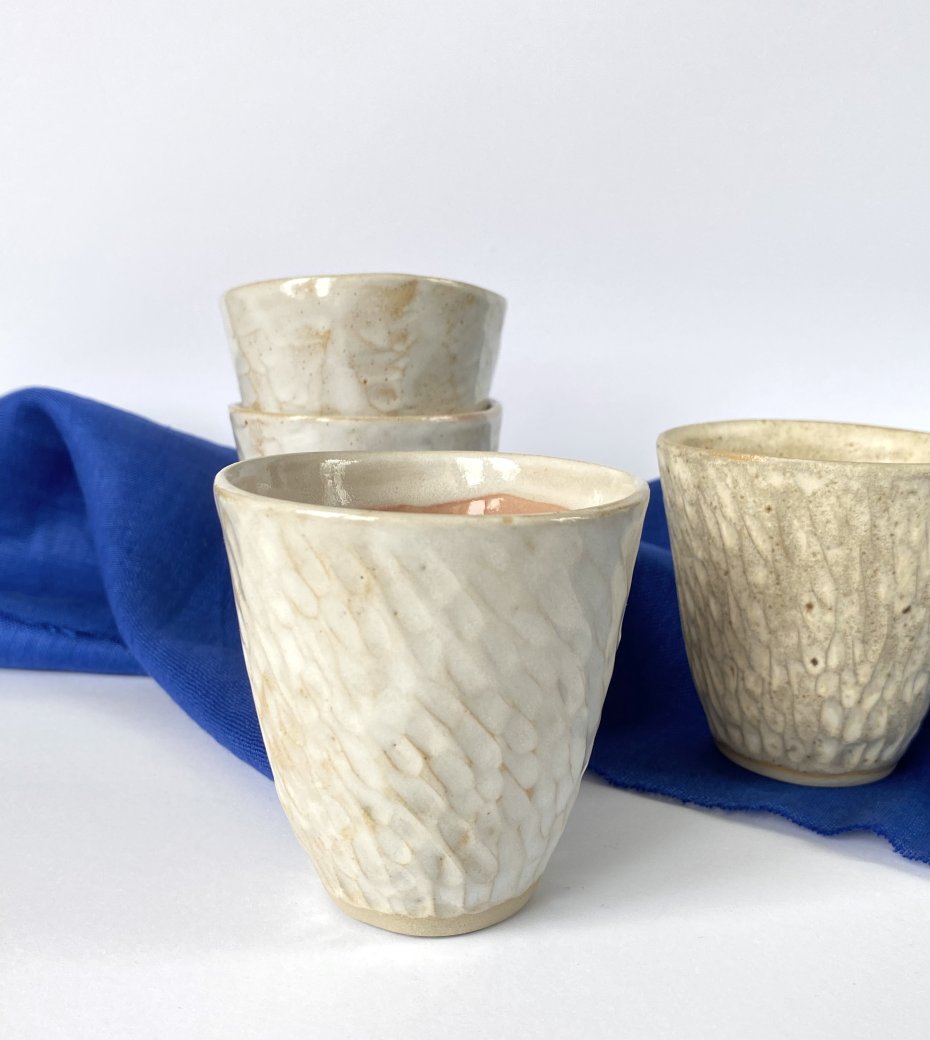 Ceramiczne kubki wykonane ręcznie z jasnobeżowej gliny. Pomalowane szkliwami dopuszczonymi do kontaktu z żywnością. Można myć w zmywarce.