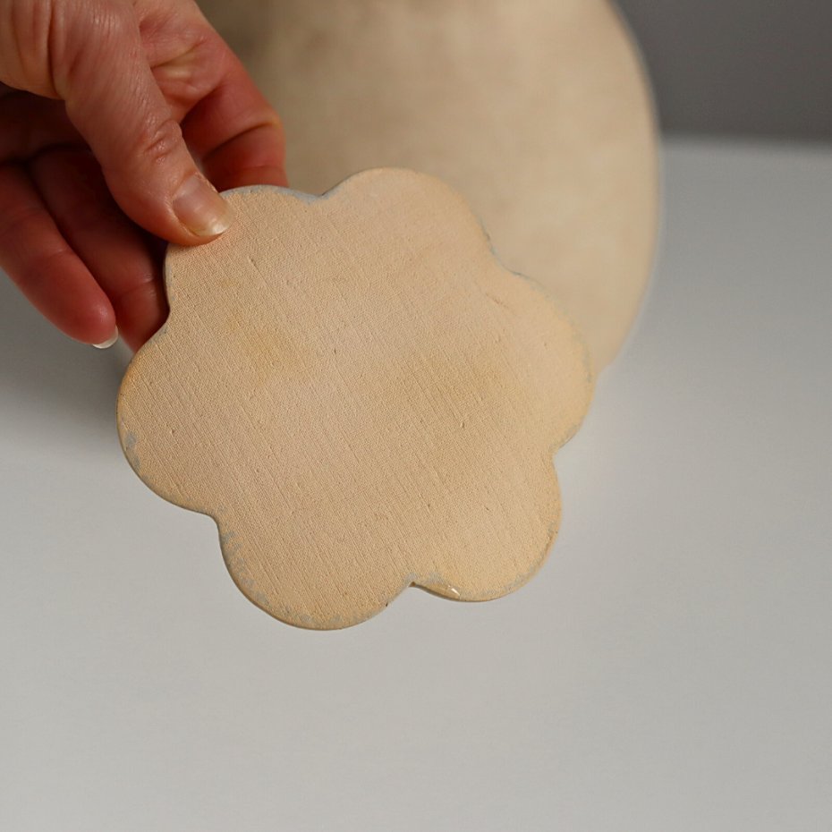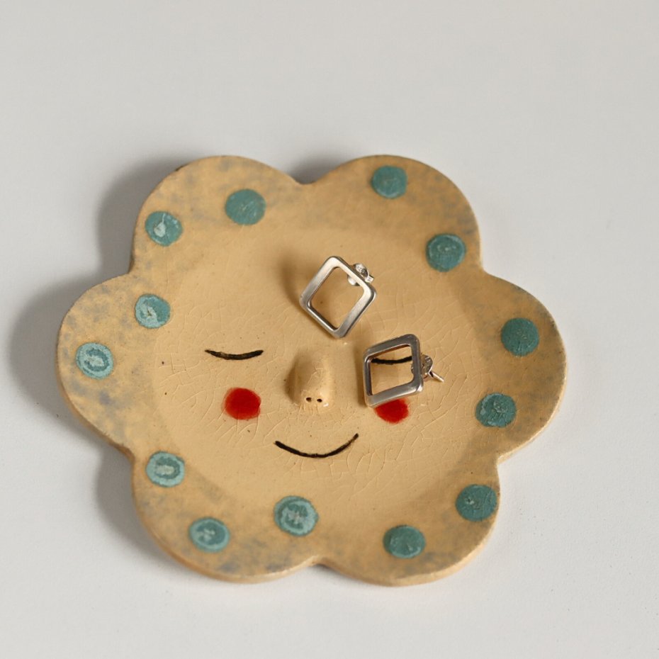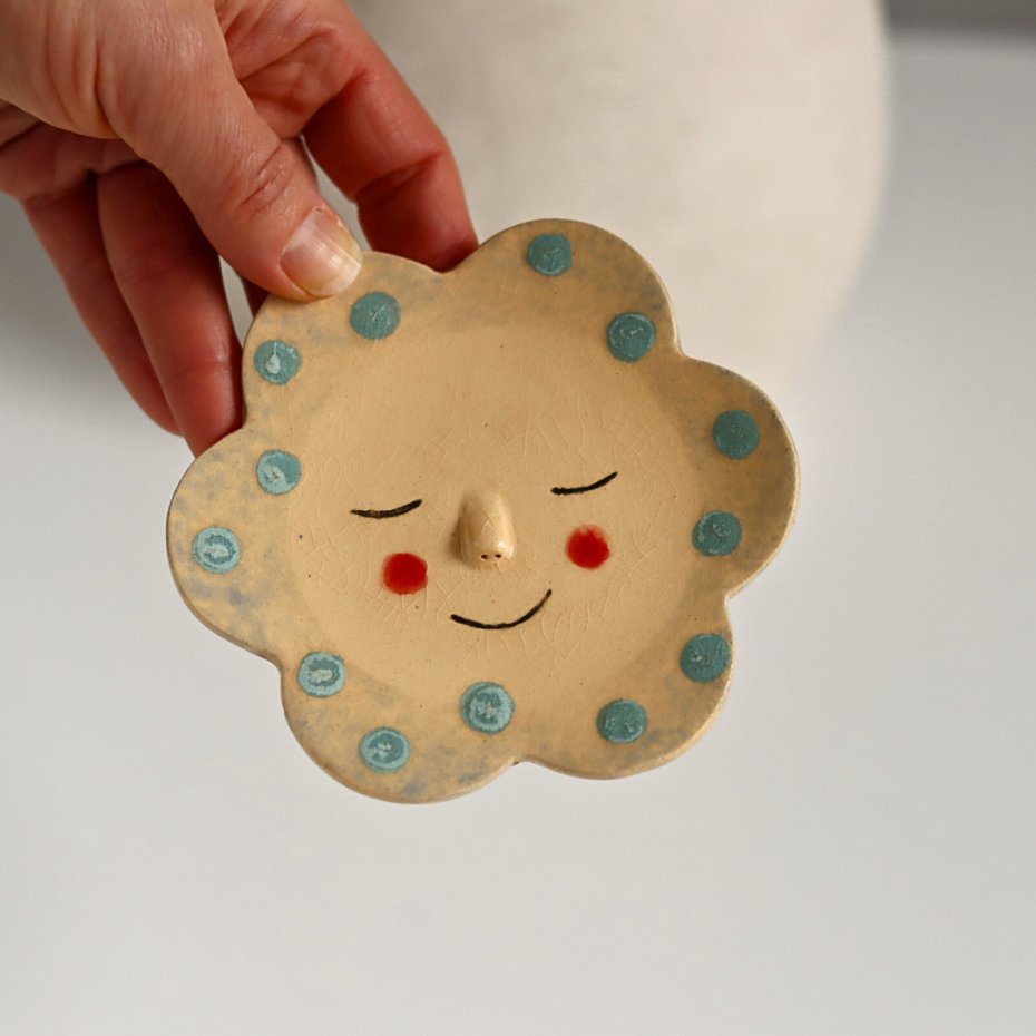 Ręcznie lepiony i malowany ceramiczny talerzyk kwiatek, podstawka na biżuterię wykonana z jasnej gliny. Talerzyk z buźką, kropki w kolorze miętowym