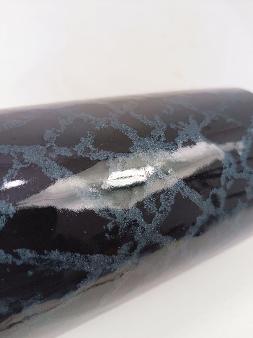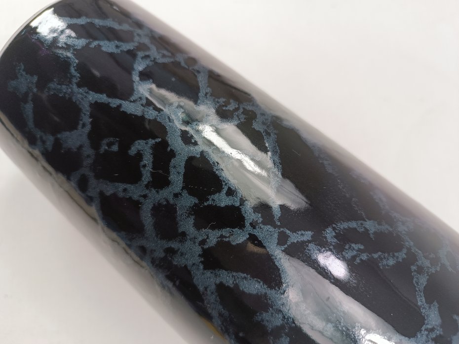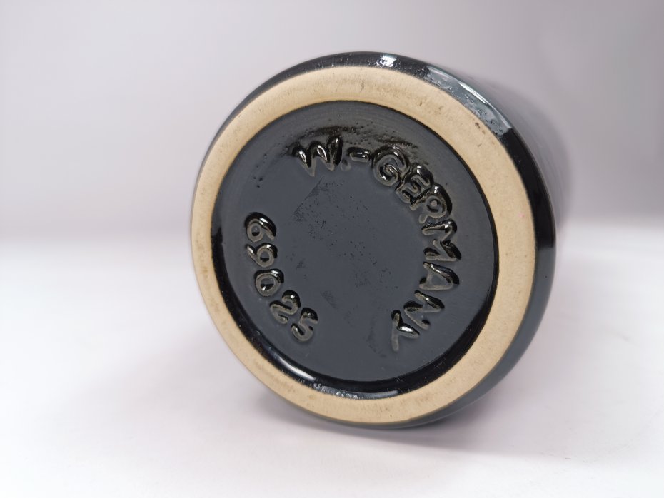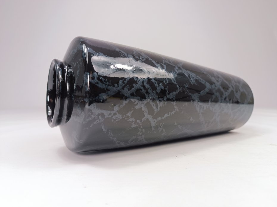 Niemiecki, ceramiczny wazon w kolorze czarnym, z ozdobnym lekko błyszczącym wzorem (bardzo drobny delikatny brokat). Stan zachowania wazonu bardzo dobry. Wysokość 25 cm.
