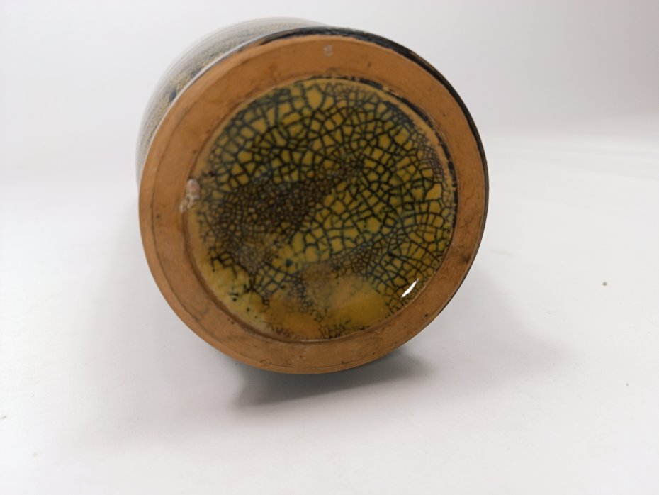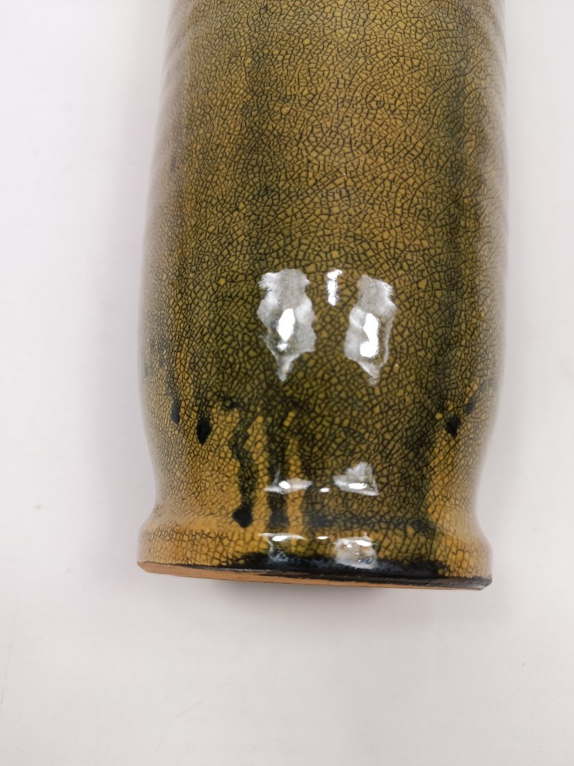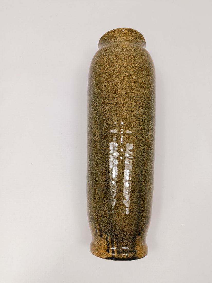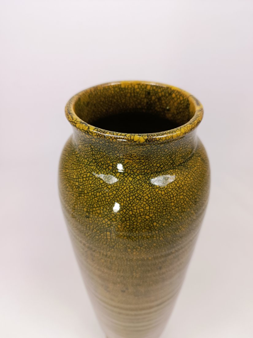 Ceramiczny, smukły wazon z dekoracyjnym efektem popękanej glazury, która tworzy wzór przypominający pajęczynę. Efekt ten jest znany jako krakelura, czyli sieć spękań na powierzchni szkliwa. Wazon zachowany w bardzo dobrym stanie, bez uszkodzeń. Wysokość 37 cm.
