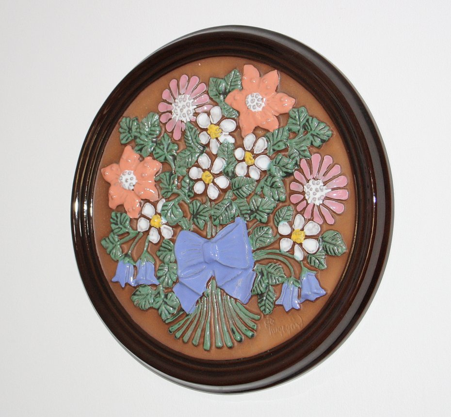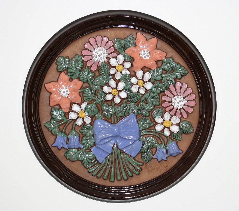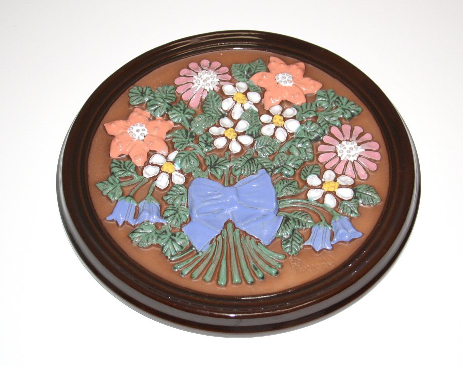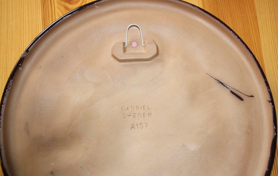 Ceramiczny obrazek sygnowany GABRIEL SWEDEN A 157. Motyw rośliny i ramka szkliwiona w połysku, tło matowe. Ceramika pochodzi ze Szwecji. Kolekcjonerska ceramika szwedzka.