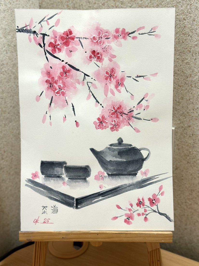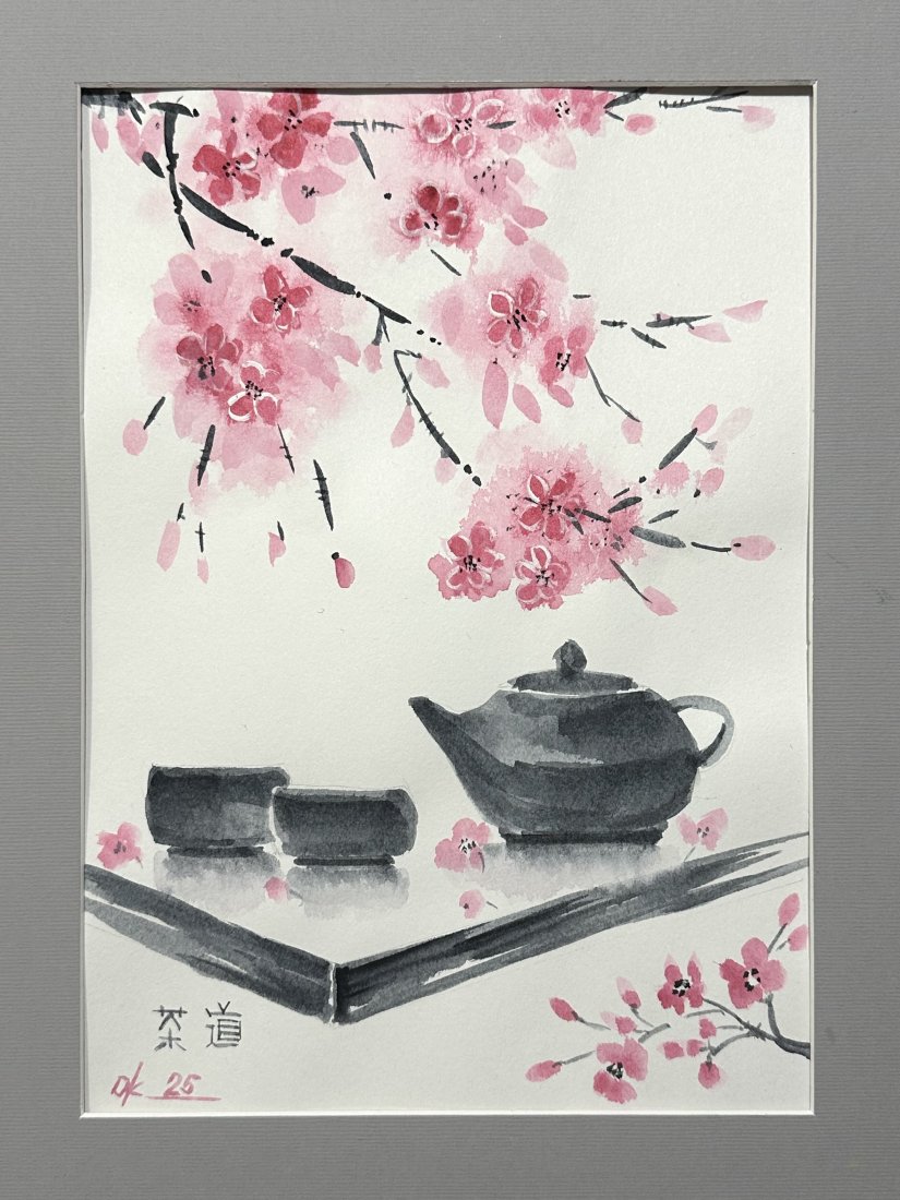 Na pierwszym planie widoczny jest tradycyjny czarny czajniczek z dwiema miseczkami na lakierowanej tacy. Ich blask i gładkie linie tworzą poczucie spokoju i harmonii. Gałęzie wiśni, namalowane lekkimi i swobodnymi pociągnięciami pędzla, otaczają kompozycję, nadając jej lekkości i wdzięku.