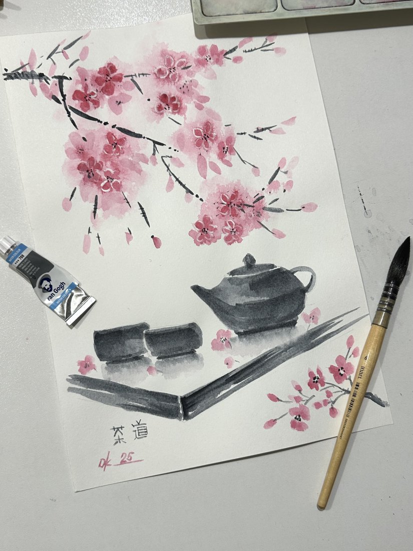 Ten delikatny obraz sumi-e uchwyca atmosferę japońskiej ceremonii parzenia herbaty na tle kwitnących wiśni.
