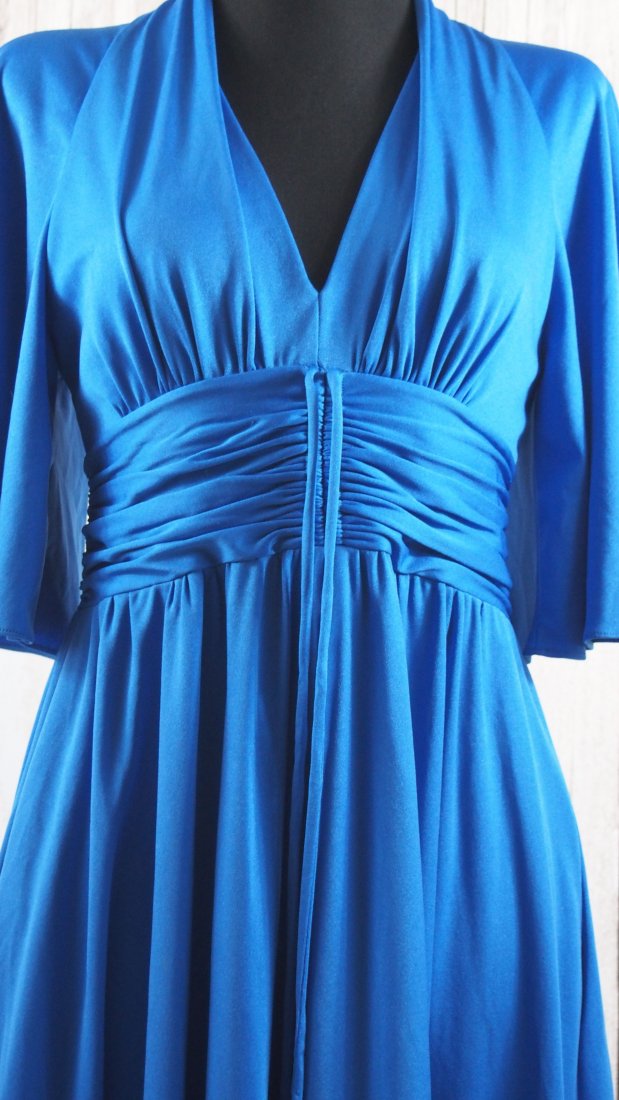 Piękna chabrowa sukienka o nieprzeciętnym kroju. Z lat 60-tych. W pasie kieszenie.
