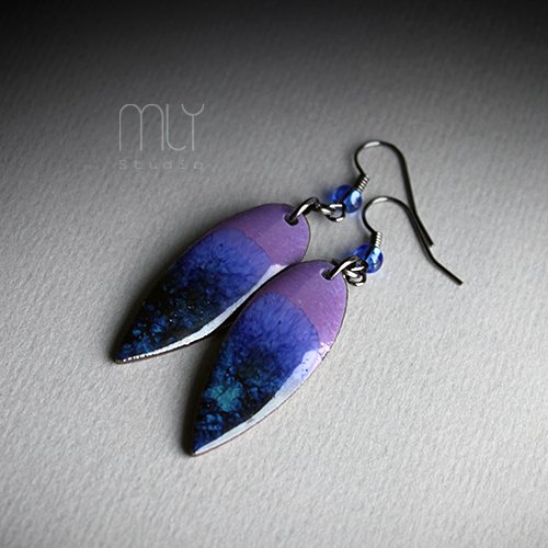 Oryginalne i efektowne ceramiczne kolczyki w formie gronek, ręcznie wykonane z gliny kamionkowej, jednostronnie szkliwione mieszanką błękitnych i fioletowych szkliw z efektem drobnych plamek, na biglach w kolorze ciemnego srebra. Długość około 5cm. Polecam