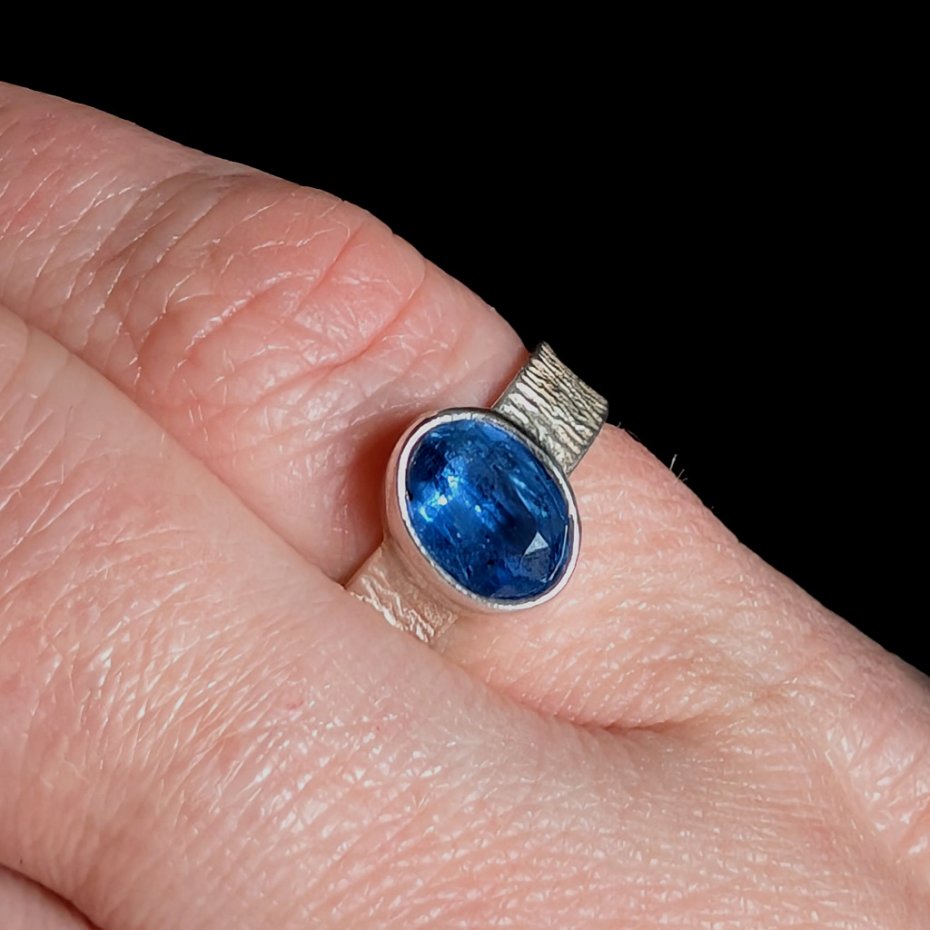 Kobiecy, subtelny pierścionek wykonany ze srebra pr. 925 oraz delikatnego, świetlistego kyanitu w chabrowym odcieniu. Pięknie fasetowany kamień o wymiarach oprawy 9 x 7 mm. Obrączka ma 5mm szerokości. Rozmiar jubilerski 10. Waga 3,5 g. Pierścień zostanie zapakowany w ozdobne pudełeczko.
