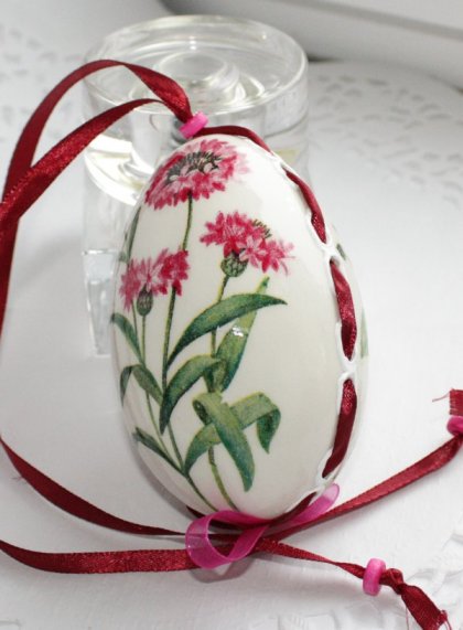Pisanka z gęsiej wydmuszki ozdobiona techniką decoupage,na obwodzie posiada otworki przez które przewleczona jest atłasowa wstążeczka ,na dole zakończona kokardką, a na górze kolorowym drewnianym koralikiem w kolorze amarantowym..Wielokrotnie lakierowana na wysoki połysk.Może być ozdobą wielkanocnego stołu.