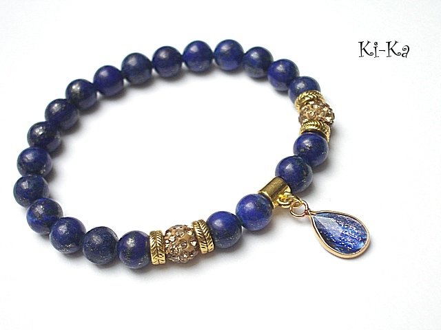 PROJEKTY AUTORSKIE. Bransoletka wykonana z lapisów lazuli [8mm] ,kuleczek shamballa wysadzanych kryształkami swarovskiego [8mm] ,efektownej zawieszki w okuciu oraz elementów w kolorze złotym. Bransoletka na gumce silikonowej. Pasuje na nadgarstek .16-17cm. Biżuteria ozdobnie zapakowana