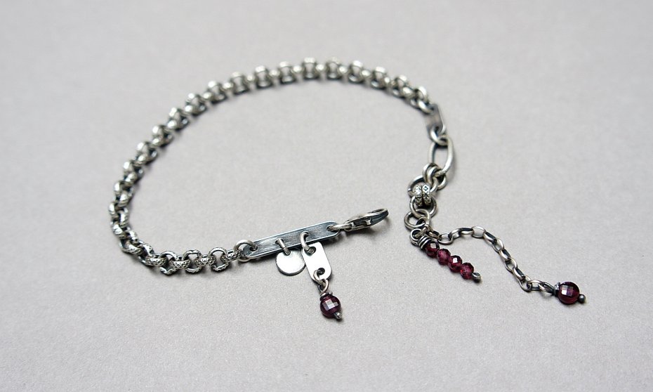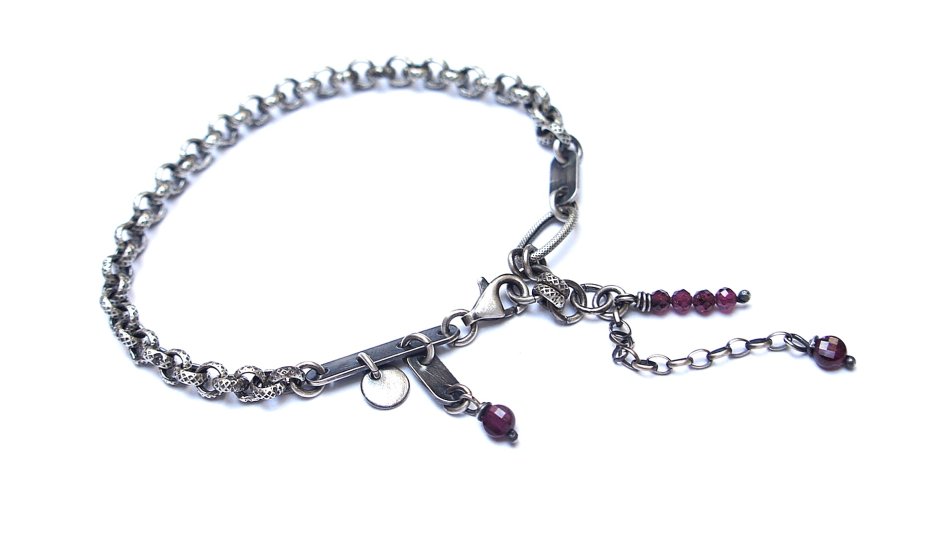 Bransoletka wykonana ze srebra pr. 925 w połączeniu z fasetowanymi kuleczkami granatów [4mm i 2mm] oraz srebrnymi blaszkami . Srebro oksydowane i przetarte. Całkowita długość bransoletki 17,5cm plus dodatkowe ogniwa i ozdobna przedłużka .