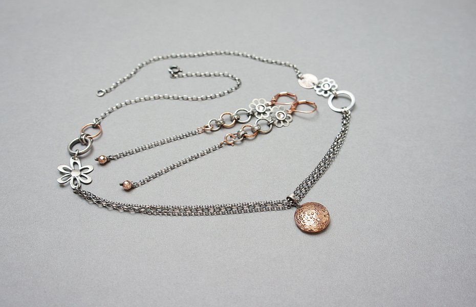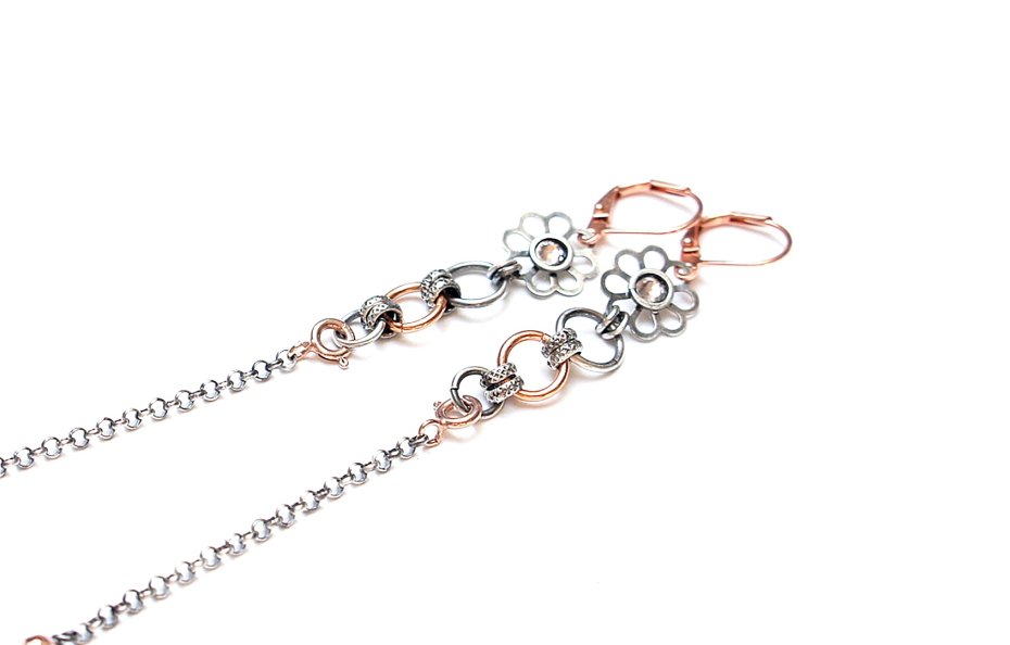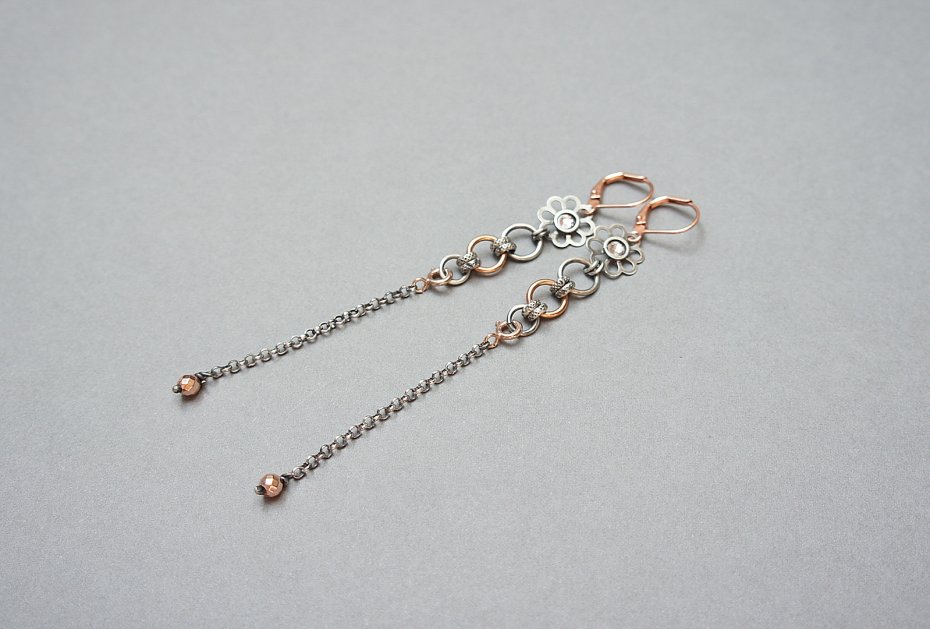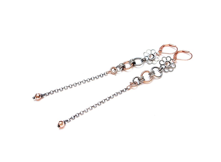 Kolczyki wykonane ze srebra [925], srebra pokrytego różowym złotem /karabińczyki - 925/ elementami z miedzi oraz fasetowanymi platerowanymi hematytami [4mm] i kryształkami Swarovski. Srebro częściowo oksydowane i przetarte. Całkowita długość kolczyków 10,5cm. Wiszącą część łańcuszka można odpiąć. Biżuteria ozdobnie zapakowana