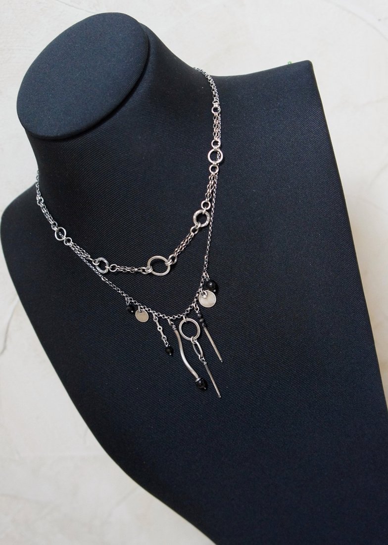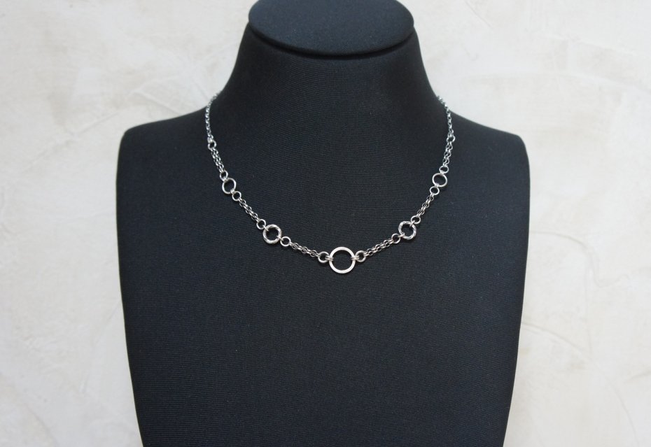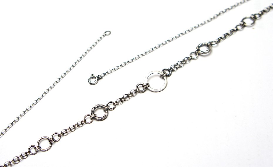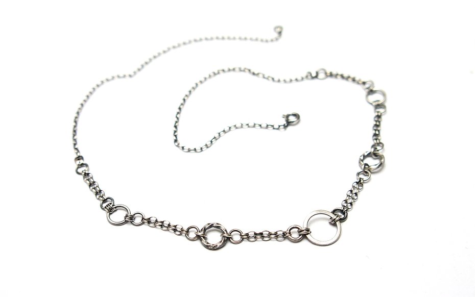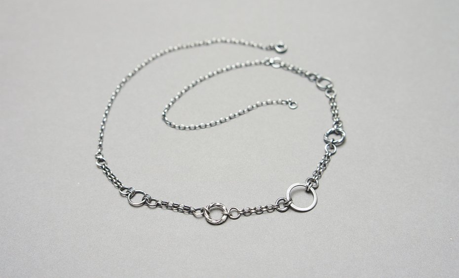 Krótki naszyjnik wykonany ze srebra [pr. 925]. Srebro oksydowane i przetarte. Całkowita długość łańcuszka około 49cm. Biżuteria ozdobnie zapakowana.