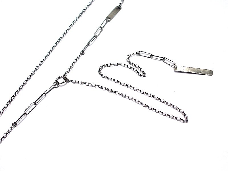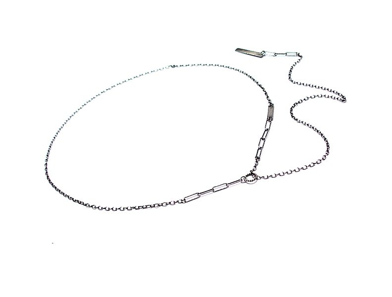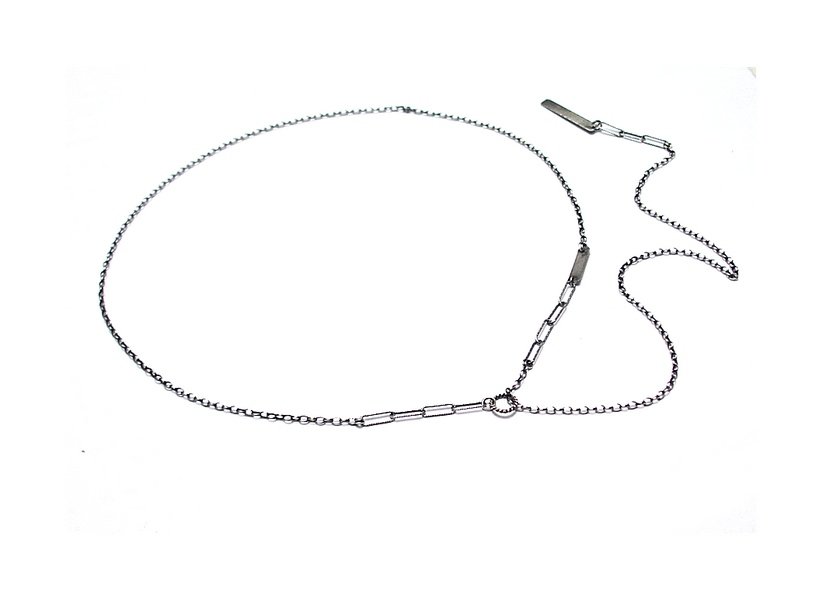 Naszyjnik wykonany własnoręcznie ze srebra [pr. 925]. Naszyjnik przekładany przez kółeczko. Srebro oksydowane i przetarte. Całkowita długość łańcuszka 81,5cm. Biżuteria ozdobnie zapakowana.