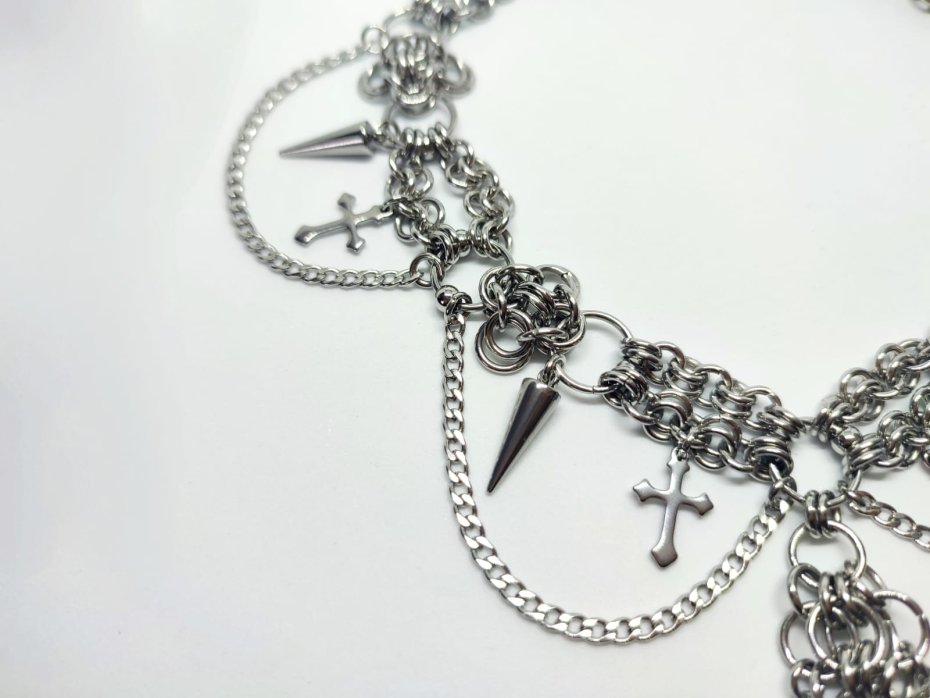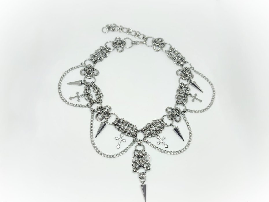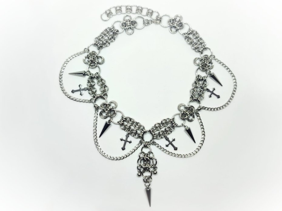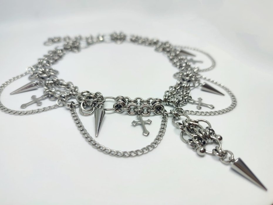 Naszyjnik wykonany został z wysokiej jakości stali chirurgicznej (łączniki, drut, jump rings) oraz stali nierdzewnej (łańcuch, krzyże, kolce, kulki). Elementy ozdobne – kolce i krzyże – przywodzą na myśl amulet wojownika, zaklęty relikt lub część ceremonialnej zbroi.