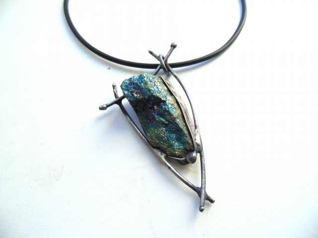 Wisiorek wykonany techniką witrażową z chalkopirytu. Zawieszony na czarnej lince kauczukowej o długości ok. 45 cm. Wymiary całości ok. 7 na 3,5 cm.