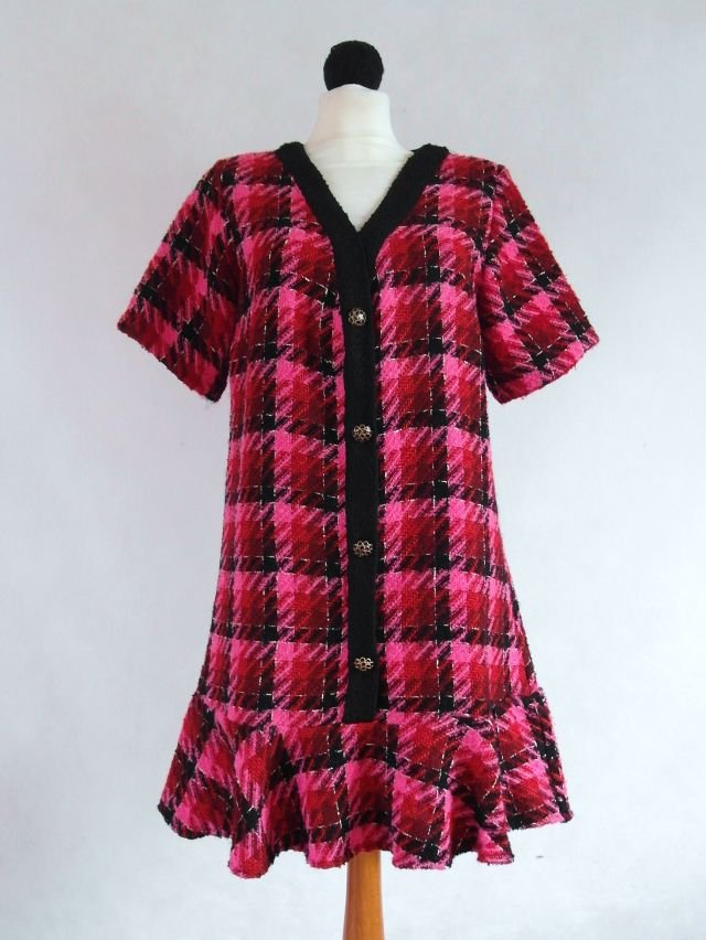 kratka i splot w stylu Chanel,kolory czerwień, bordo, różowy i czarny.U dołu falbanka, dodaje lekkości. Guziki przez środek, czarno/złote, przyszyte, nie odpinają się.Niweluje niedoskonałości, nie pogrubia. Bez podszewki, przyjemny materiał.