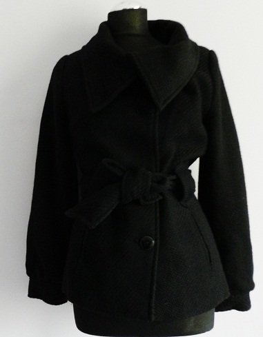 Zapinany na guziki i wiazany w talii, szerokie kołnierz, po bokach kieszenie, kolor czarny, stan idealny,rozmiar z metki 36/38