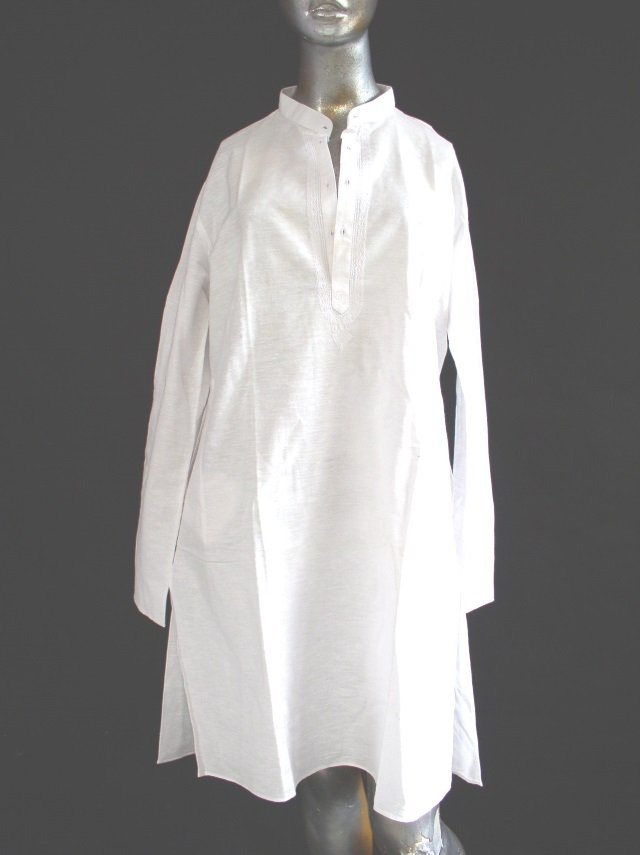 Tunika firmy Charagh Din.Rozmiar 38.Brak rodzaju materiału.W koło szyi stójka.Rozcięcie na środku ozdobione haftem+dziurki po obu stronach.Rękaw długi,szeroki.Dwie kieszenie w bokach,chowane do środka.Rozporki po bokach 32 cm.Na ramionach mereżka.Stan bardzo dobry,brak śladów używania.Długość 98 cm.pod pachami 114 cm.Kolor biały,ale nie śnieżny.
