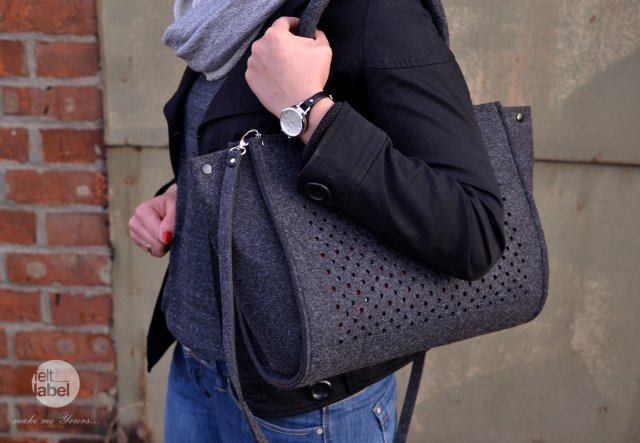 Fantastyczna torebka z grafitowego filcu z wygodnymi w trzymaniu rączkami. Przez kółeczka o średnicy 5 mm wycięte z obu stron prześwituje "usztywnienie" które zrobione jest z kraciastej tkaniny, dzięki niemu torebka dyskretnie nabiera koloru. Pomieści wszelkie niezbędne kobietom drobiazgi i nie tylko ;) (gazety, dokumenty (A4), kosmetyki, klucze, rzeczy dla dziecka – wszystko znajdzie w niej bezpieczną przystań ;)