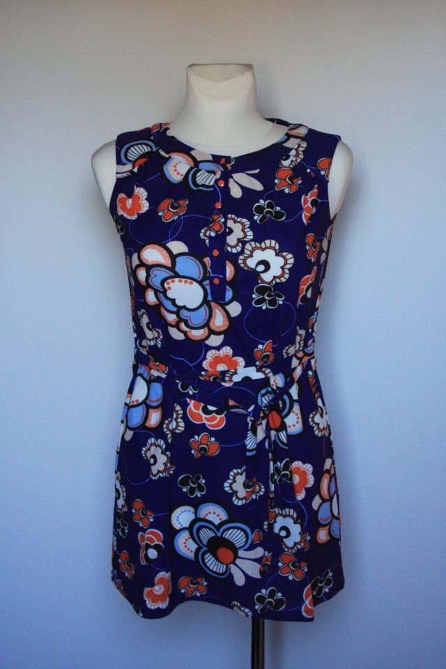 kolorowa tunika w stylu retro, przewiązywana materiałowym paseczkiem, z przodu zapinana na guziki