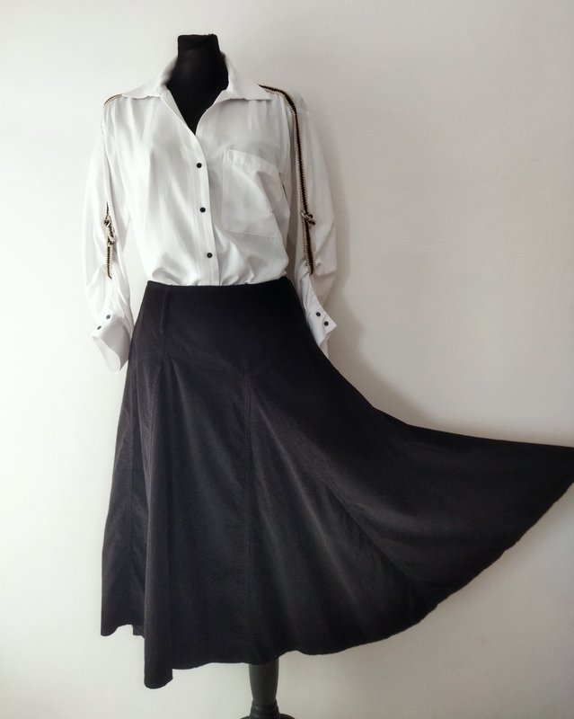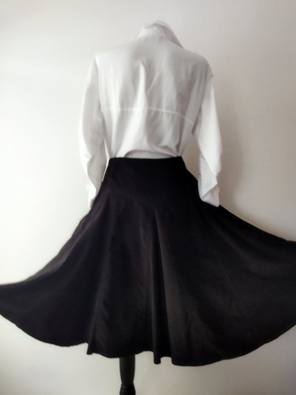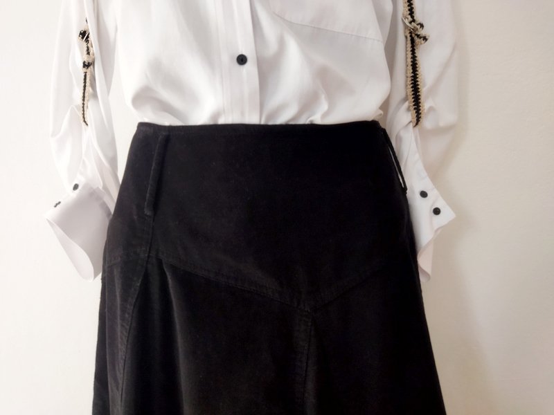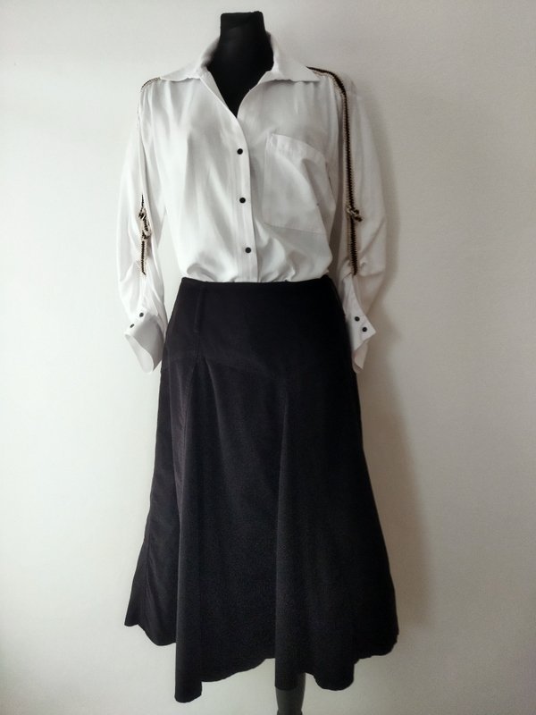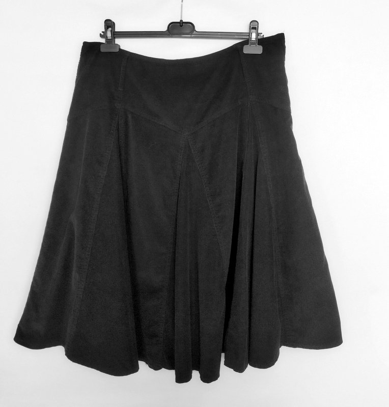 Spódnica z drobnego sztruksu w czarnym kolorze. Na 17 cm karczku z naszywanymi szlufkami , rozkloszowana od bioder wszywanymi godetami. Zapinana z boku na zamek. Bez podszewki