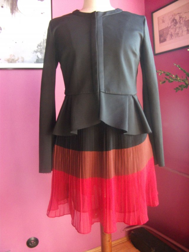 ŚWIETNY Z MIĘSISTEJ ELASTYCZNEJ TKANINY Z LEKKIM POŁYSKIEM, ROZMIAR 38,ZAPINANY NA DUŻE SREBRNE HAFTKI,95 % POLYESTER 5% ELASTAN