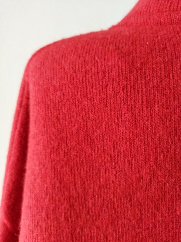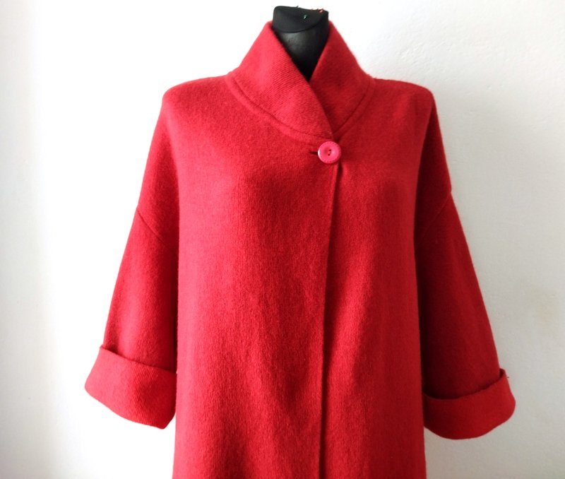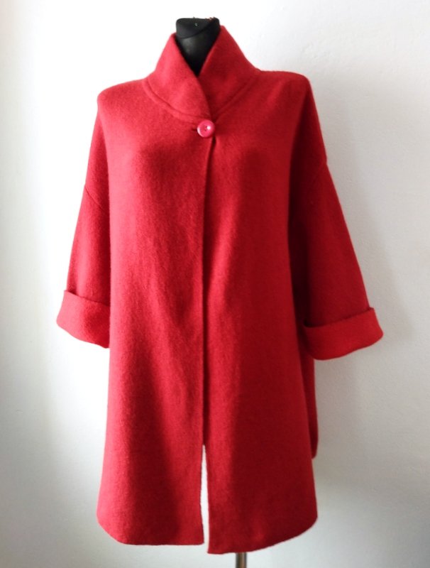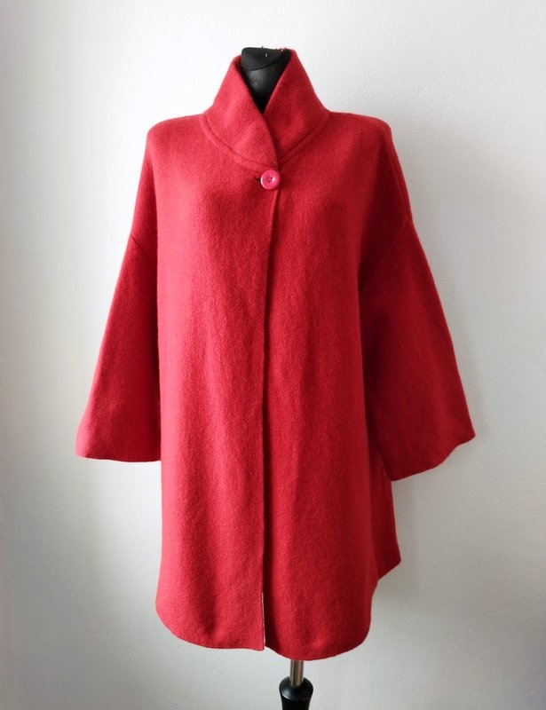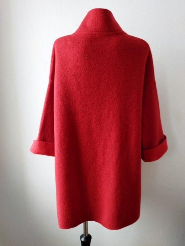 Dłuższy bardzo dobrej jakości sweter lub dzianinowy w kolorze nasyconej czerwieni. Trapezowy fason z krótkim szalowym kołnierzem. Zapinany u góry na jeden duży guzik.