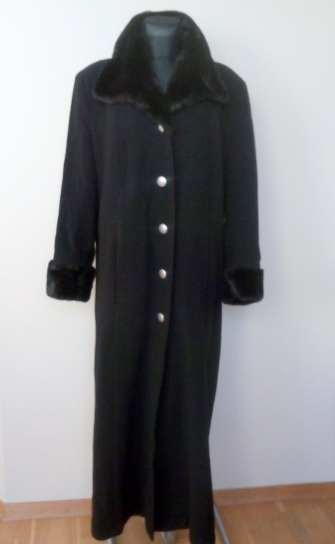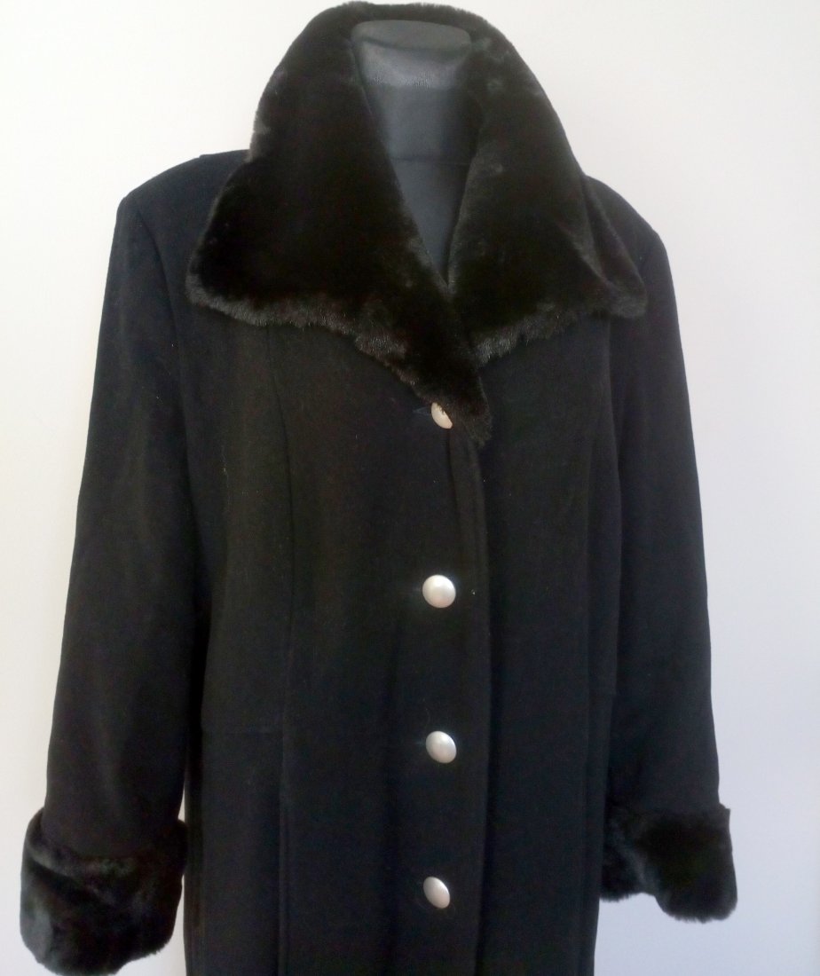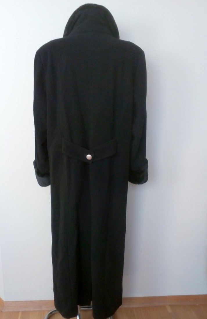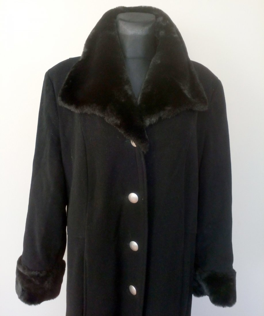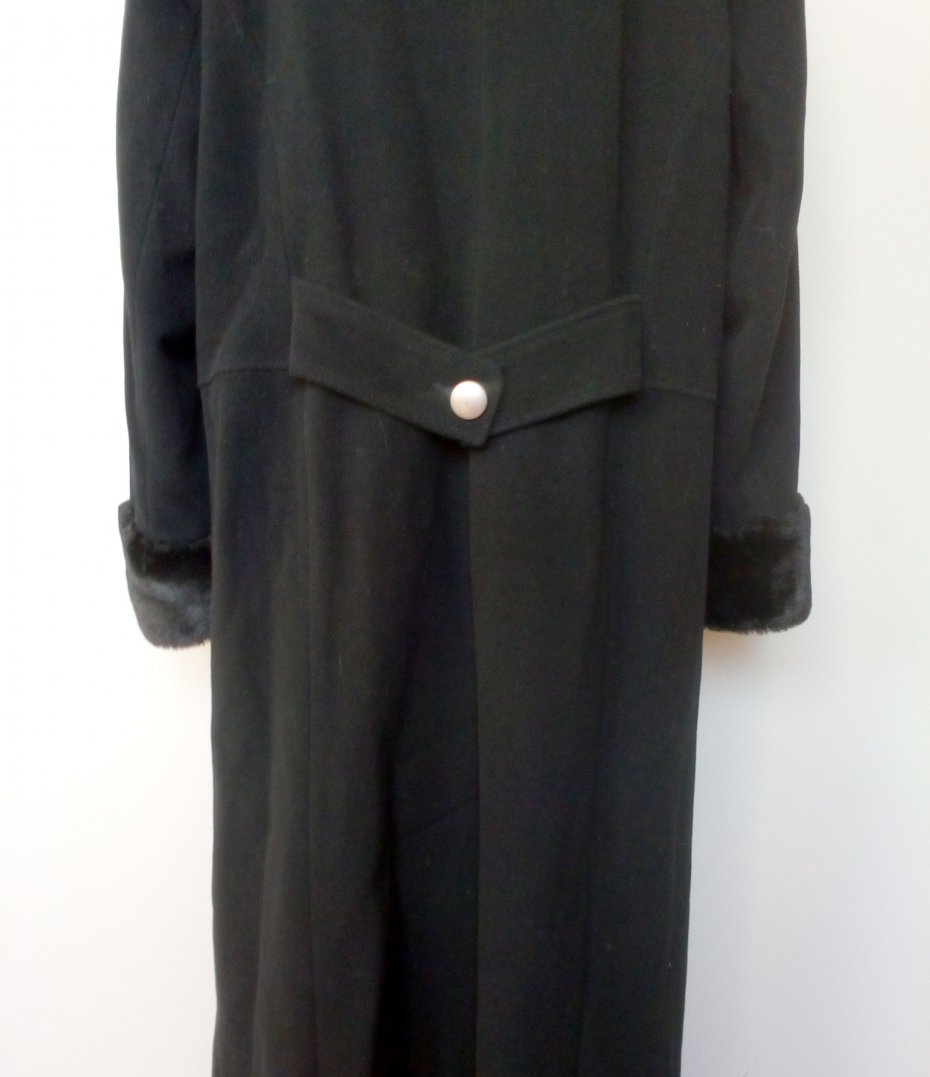 Długi, wełniany płaszcz z futerkowym kołnierzem i mankietami, kolor czarny, zapinany na metalowe guziki w srebrnym kolorze, w szwach z przodu pionowo wpuszczane kieszenie, w tyle wysokie, zakładane rozcięcie, od środka czarna podszewka i boczna kieszeń