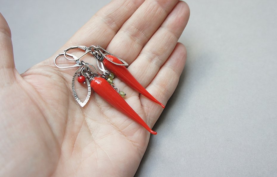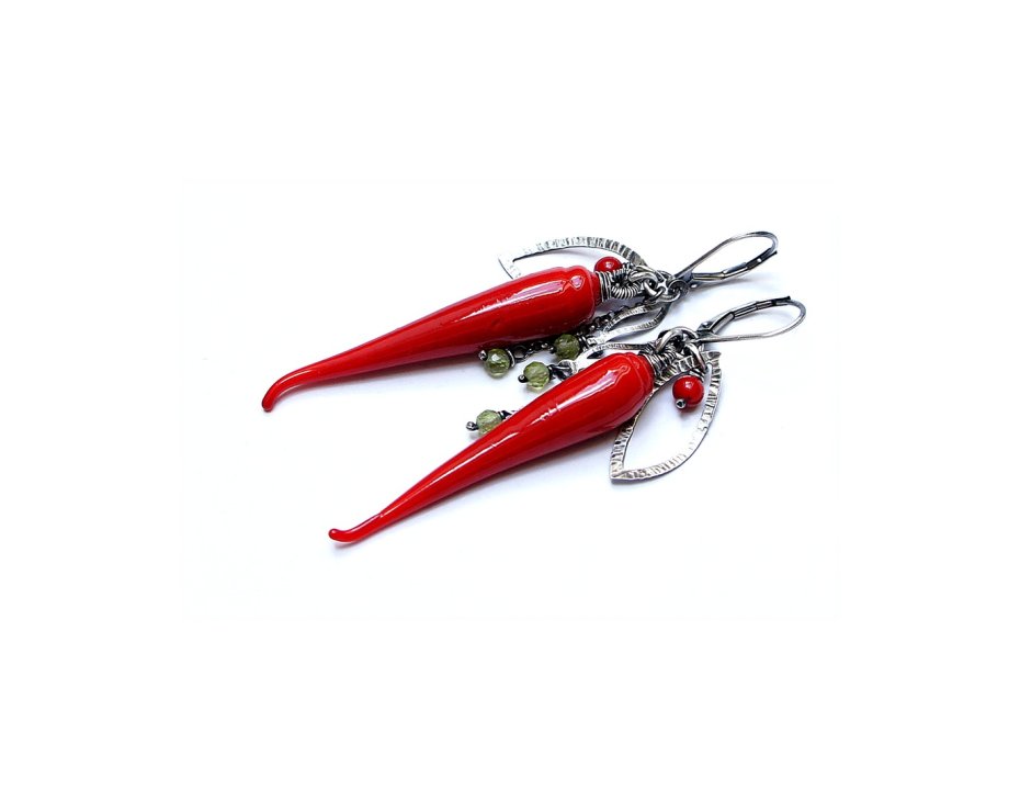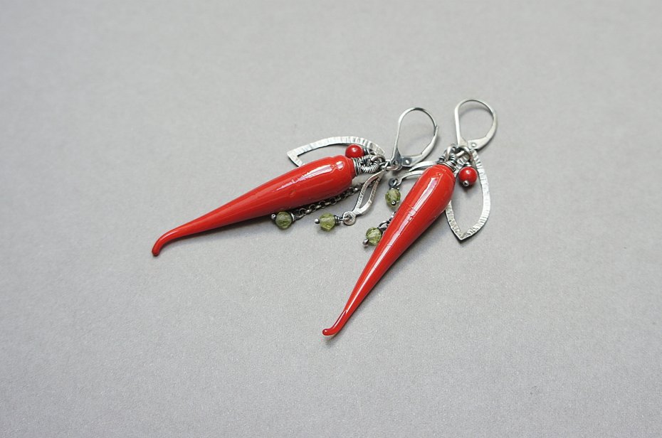 Kolczyki wykonane ze srebra [pr. 925 i 999] w połączeniu z ręcznie wykonanymi szklanymi papryczkami [ok. 45mm -nie ma dwóch identycznych ], kuleczkami korala [4mm ],fasetowanymi perydotemi[3mm] oraz srebrnymi blaszkami . Srebro oksydowane. Całkowita długość kolczyków około 7,1cm. Biżuteria ozdobnie zapakowana.