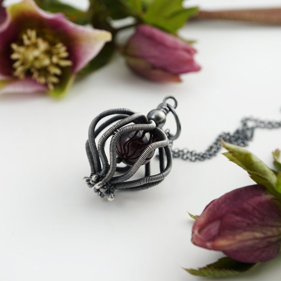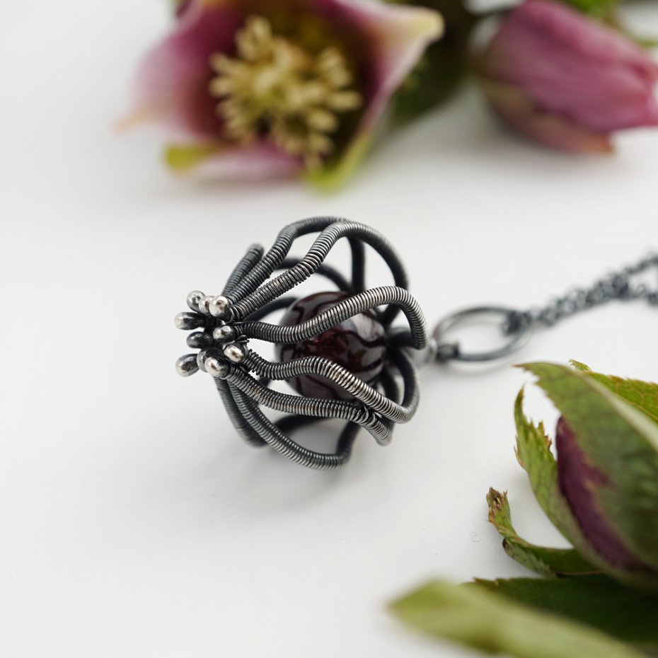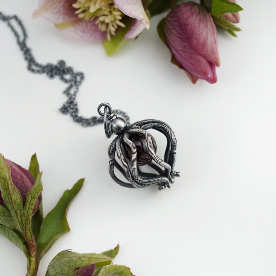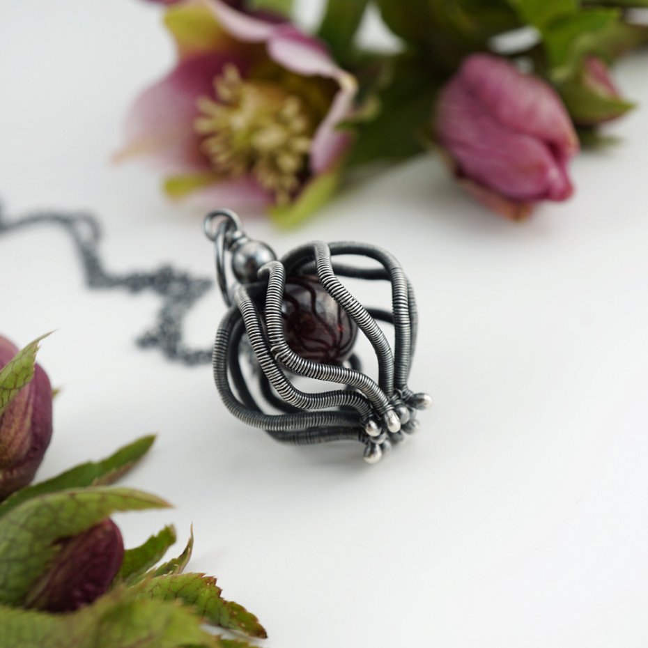 Wisior zaprojektowany i wykonany przeze mnie od podstaw, z wykorzystaniem pracochłonnej i precyzyjnej techniki wire wrapping, ze srebra próby 925 oraz gładkiej kuli granatu w głębokim kolorze czerwonego wina. Srebro mocno przyciemnione (oksydowane), polerowane, miejscami przecierane, aby podkreślić przestrzenność fantazyjnego wzoru.