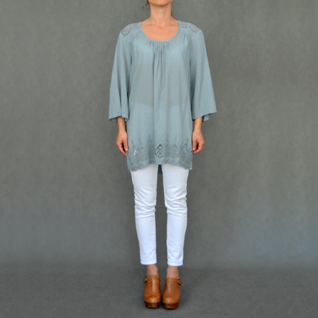 Piękna bluzka - tunika w kolorze chłodnego błękitu. Luźna. Dół i ramiona ozdobione haftowanymi wstawkami. Polecam.