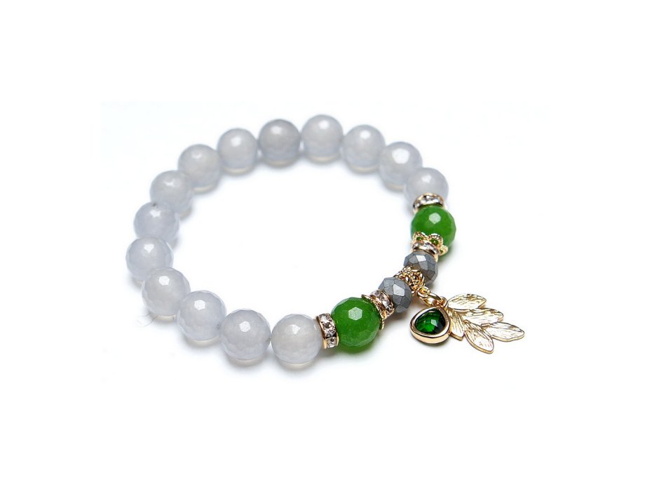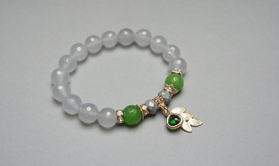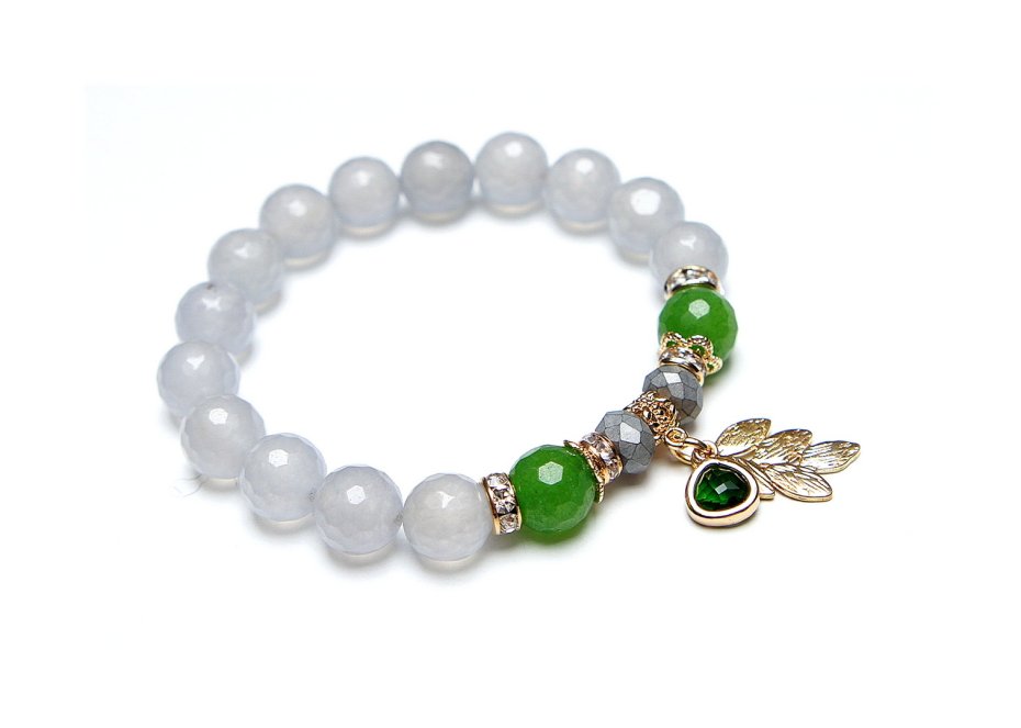 Bransoletka wykonana z kamieni naturalnych - jadeit fasetowany [10mm], zawieszki z kryształem w okuciu, kryształków fasetowanych [6mm] oraz elementów metalowych w kolorze złota. Bransoletka na gumce silikonowej. Pasuje na nadgarstek 15-16cm.