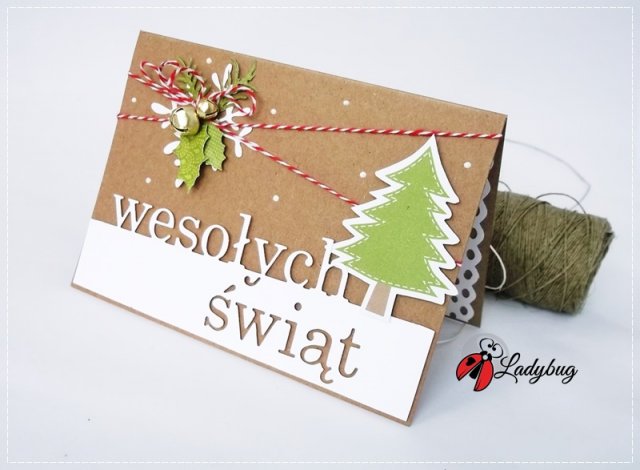 Wyjątkowa kartka świąteczna, prosta w formie i oszczędna w stylu, jednakowoż niebanalna i pełna ciepła. Utworzony ze śnieżnej zaspy napis, zielona choinka i nad tym zawieszony na czerwono-białym sznurku aniołek. W tle bielutkie, wypukłe śnieżynki.