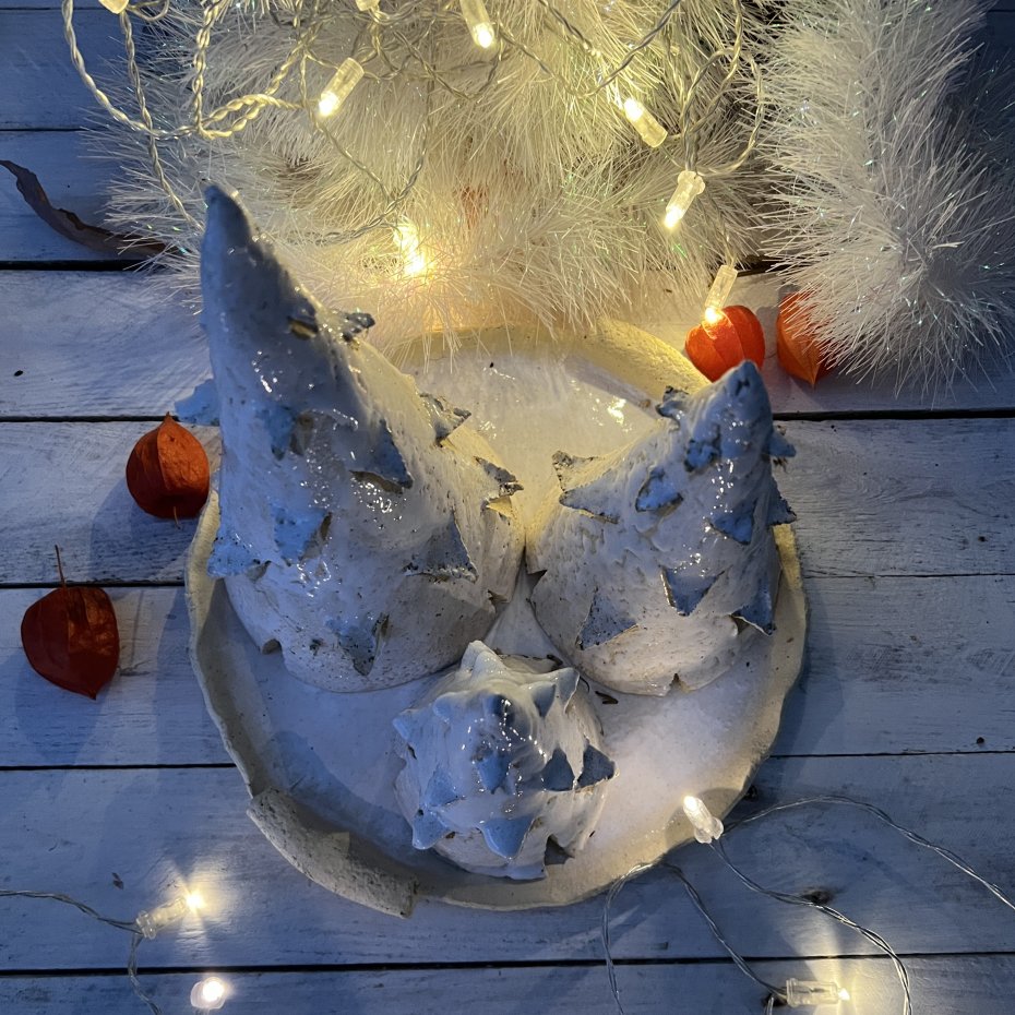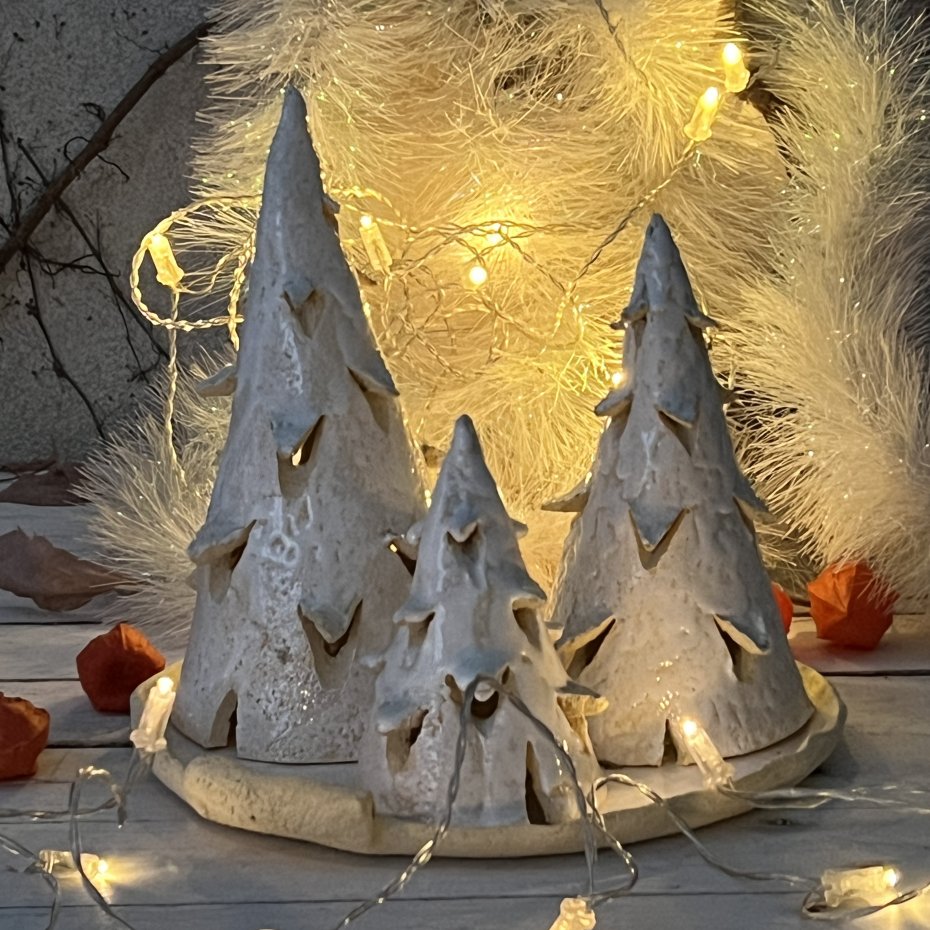 Zestaw trzech ręcznie wykonanych ceramicznych latarenek w kształcie choinki na tacy z uchwytami. To wyjątkowa dekoracja świątecznego stołu. Dekoracja jest uformowana z jasnej gliny szamotowej i poszkliwiona białym szkliwem w sposób, który przypomina naturalne czapy śnieżne. Można używać z tea lightami (uwaga czubek choinki może być gorący, należy chwytać w połowie) lub bez.