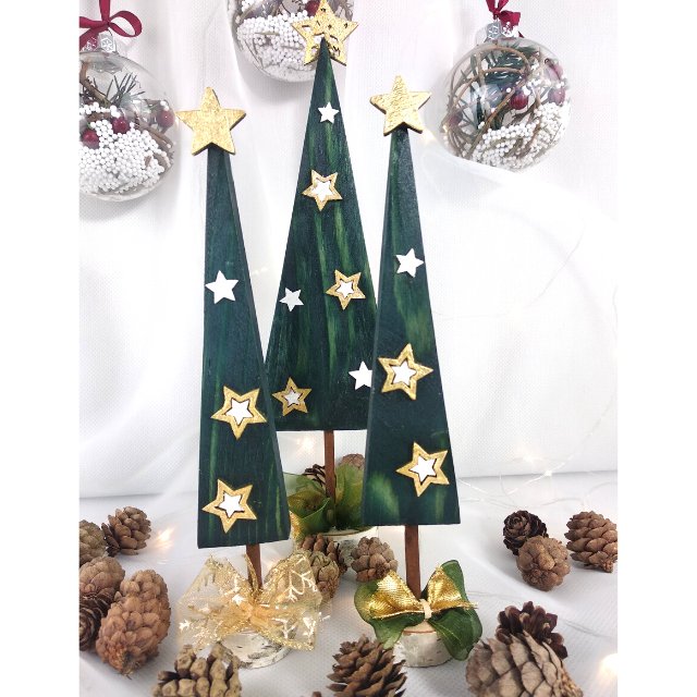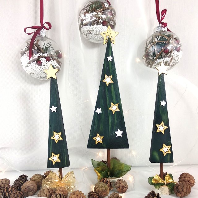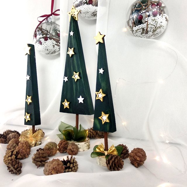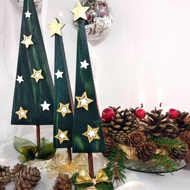 Ręcznie wykonane miniaturowe choinki to wyjątkowa ozdoba, która wprowadzi do Twojego domu świąteczną atmosferę. Każda choinka została starannie wykonana z drewna i ozdobiona sztucznymi gałązkami świerku, czerwonymi jagodami oraz elegancką, czerwoną kokardką. Idealne jako dekoracja stołu, komody czy półki.