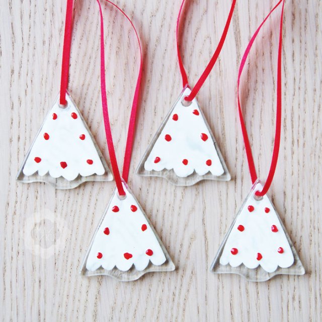 Zestaw czterech świątecznych zawieszek na choinkę wykonanych ze szkła metodą fusingu. Elementy wykonane ze szkła bezbarwnego z ręcznie malowanym i wypalanym wzorem na powierzchni. Spód szkła posiada delikatną fakturę ciekawie odbijającą światło.